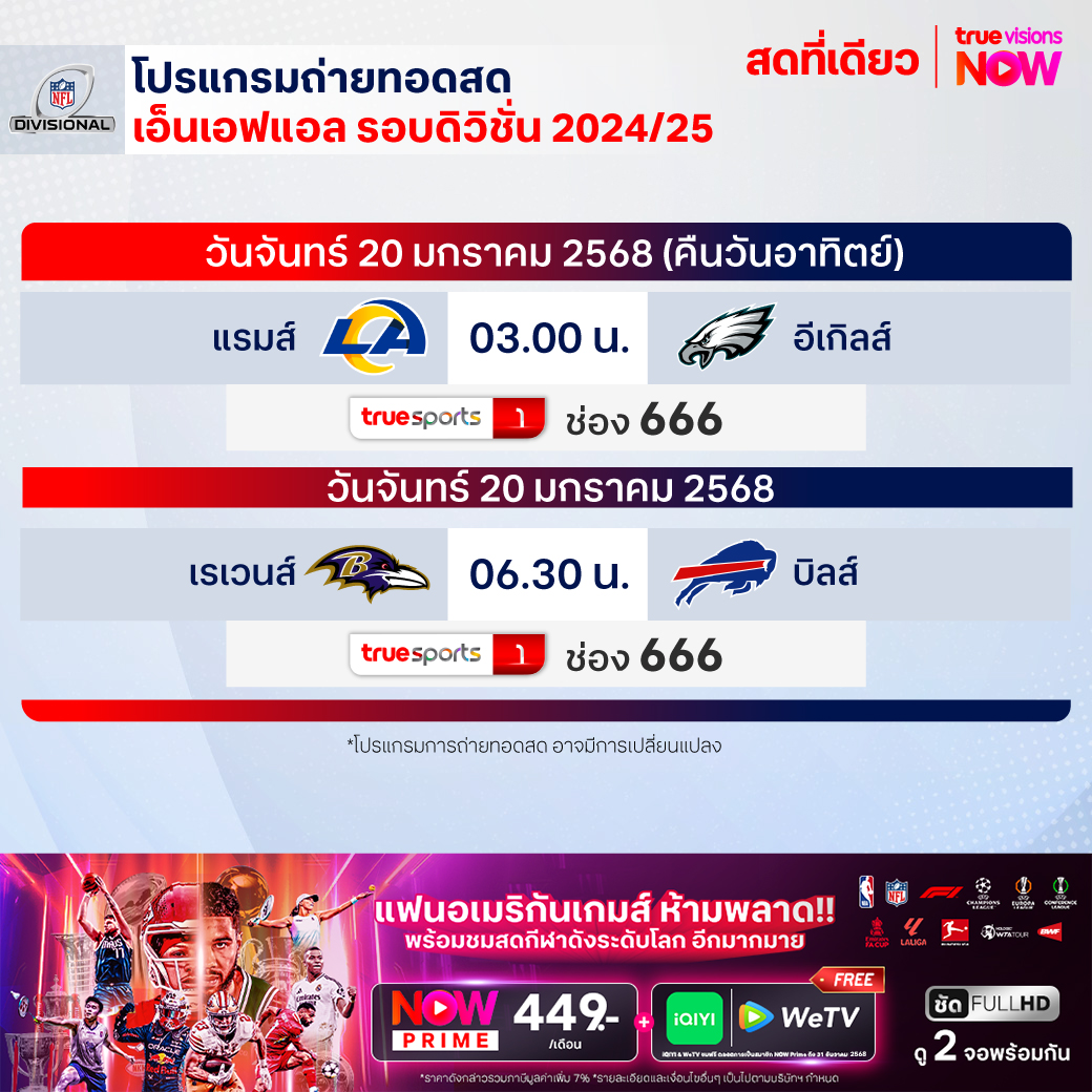 วันจันทร์ 20 ม.ค. Ravens Vs Bills เวลา 06.30 ทางช่อง TS 1 (666)