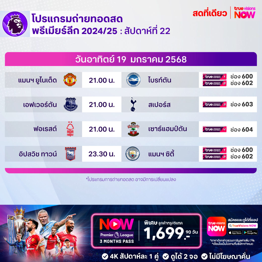Ipswich Town vs Man City เวลา 23:30 - 01:30 ทางช่อง TPF 1 (600) / TPF 2 (602)