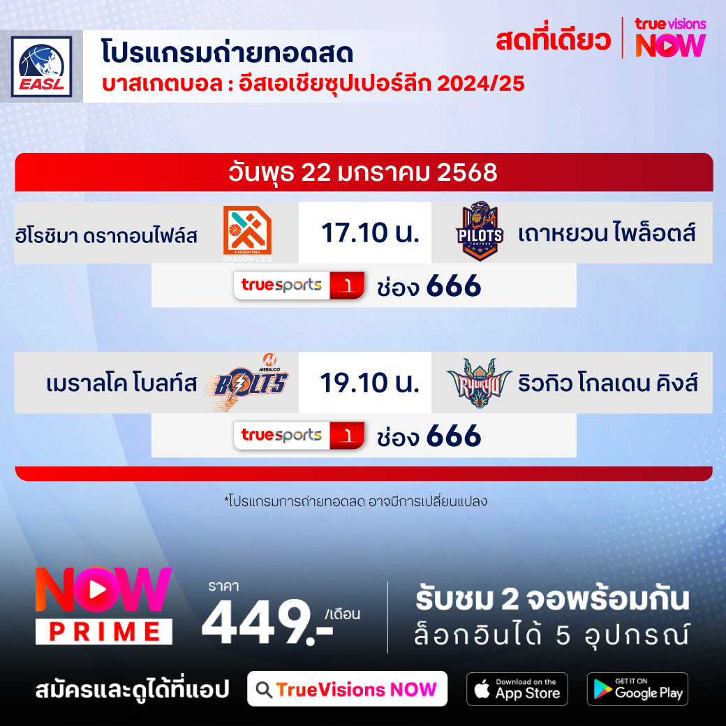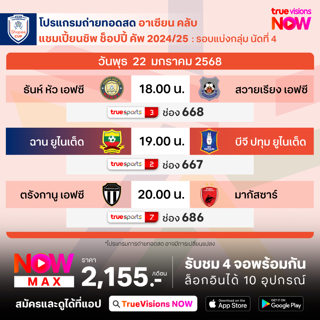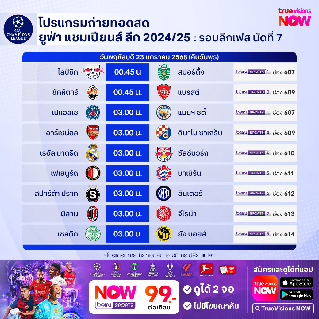 วันนี้มีอะไรดูที่ ทรูวิชั่นส์ ประจำวันพุธที่ 22 มกราคม 68 ยังคงมีกีฬาที่น่าสนใจให้ได้ตามลุ้นตามเชียร์กันเหมือนเดิม โดยในส่วนของฟุตบอลยังมีศึก ยูฟ่า แชมเปี้ยนส์ ลีก, ยูฟ่า ยูโรป้า ลีก, ซาอุดิ โปร ลีก และ อาเซียน คลับ แชมเปี้ยนชิพ ช็อปปี้ คัพ ให้ได้ตามเชียร์กันต่อ ส่วนกีฬาอื่นๆ พลาดไม่ได้กับศึกเทนนิส ออสเตรเลียน โอเพ่น แกรนด์สแลมแรกของปี, กอล์ฟ พีจีเอ ทัวร์ รายการ ฟาร์มเมอร์ส อินชัวรันส์ โอเพ่น, เดอะ กอล์ฟ ลีก 2025 และบาสเกตบอล อีสต์ เอเชีย ซูเปอร์ลีก งานนี้ ทรูวิชั่นส์ จัดเต็มให้ชมกันถึงบ้าน