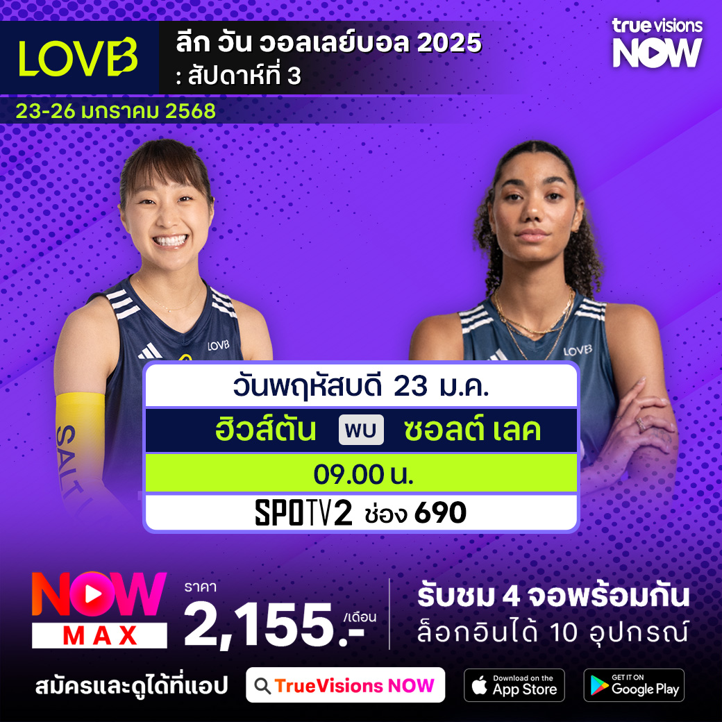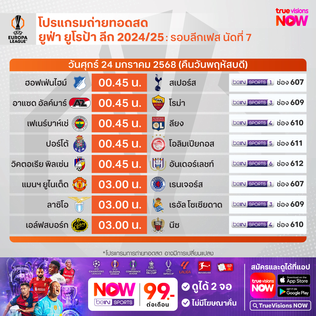 วันนี้มีอะไรดูที่ ทรูวิชั่นส์ ประจำวันพฤหัสบดีที่ 23 มกราคม 68 ยังคงมีกีฬาที่น่าสนใจให้ได้ตามลุ้นตามเชียร์กันเหมือนเดิม โดยในส่วนของฟุตบอลยังมีศึก ยูฟ่า ยูโรป้า ลีก และ อาเซียน คลับ แชมเปี้ยนชิพ ช็อปปี้ คัพ ให้ได้ตามเชียร์กันต่อ ส่วนกีฬาอื่นๆ พลาดไม่ได้กับศึกเทนนิส ออสเตรเลียน โอเพ่น แกรนด์สแลมแรกของปี, กอล์ฟ พีจีเอ ทัวร์ รายการ ฟาร์มเมอร์ส อินชัวรันส์ โอเพ่น, กอล์ฟ ดีพี เวิลด์ ทัวร์ รายการ ราส อัล ไคมาห์ แชมเปี้ยนชิพ, แบดมินตัน บีดับเบิ้ลยูเอฟ รายการ อินโดนีเซีย มาสเตอร์ส และ วอลเลย์บอล แอลโอวีบี งานนี้ ทรูวิชั่นส์ จัดเต็มให้ชมกันถึงบ้าน