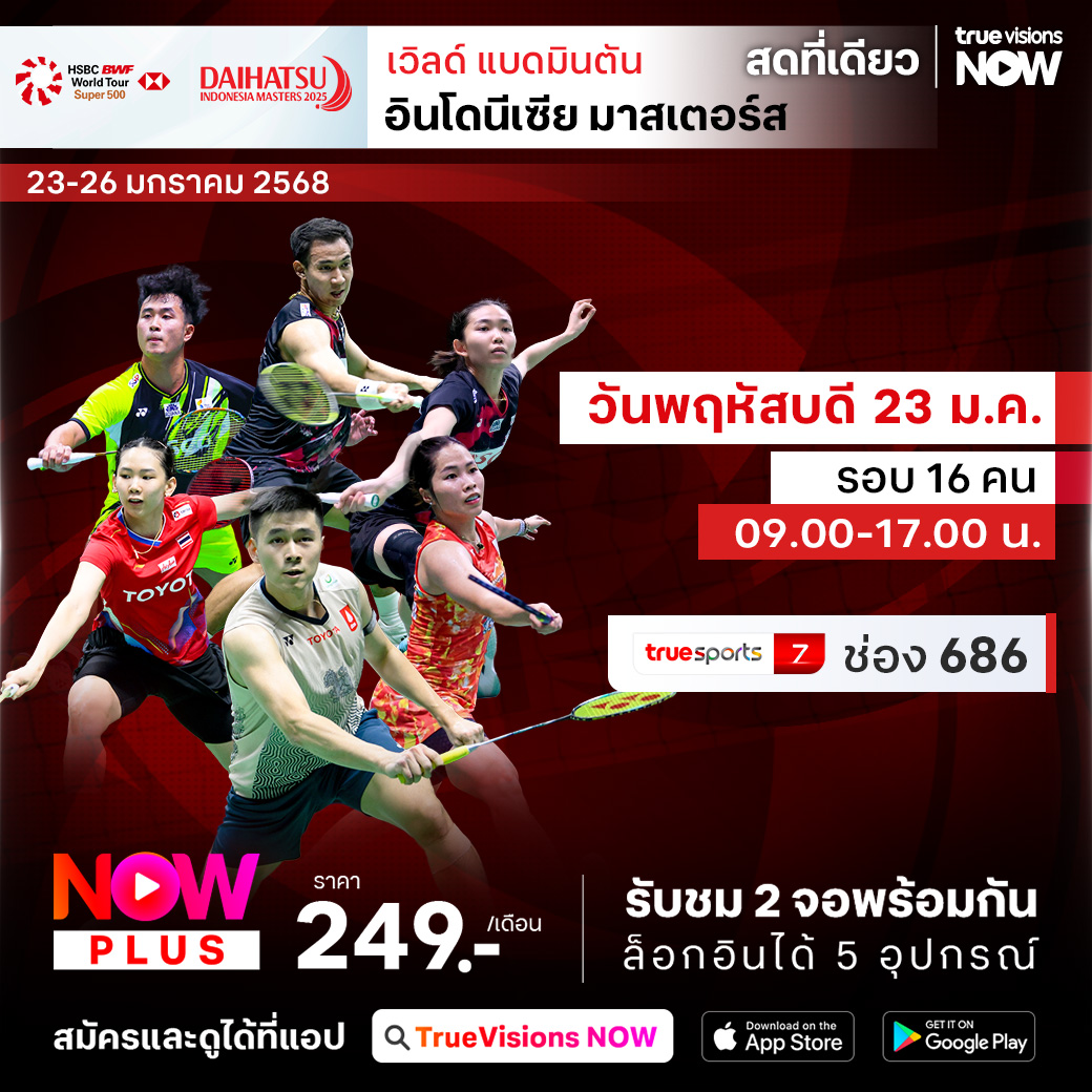 แบดมินตันเก็บคะแนนสะสมโลก ฤดูกาล 2025 สัปดาห์ที่ 3 ไปกันที่อินโดนีเซีย ชาติที่คลั่งไคล้กีฬาลูกขนไก่มากที่สุดชาติหนึ่งของโลก กับศึกแห่งศักดิ์ศรี อินโดนีเซีย มาสเตอร์ส ที่สนามสุดคลาสสิก อิสโตร่า เซนายัน ในกรุงจาการ์ต้า ร่วมส่งใจเชียร์ทีมแบดมินตันไทย สู้เพื่อคว้าชัยชนะเหนือนักกีฬาต่างชาติ ชมสด เอ็กซ์คลูซีฟ ที่เดียวที่ ทรูวิชั่นส์