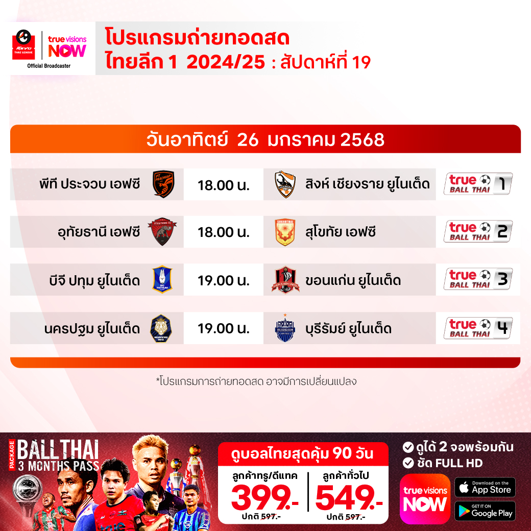นครปฐม ยูไนเต็ด พบ บุรีรัมย์ ยูไนเต็ด เวลา 19.00-21.00 ทางช่อง True Ball Thai 4
