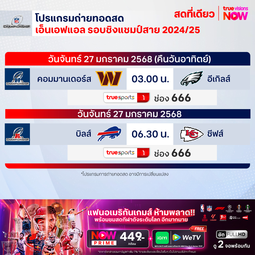 วันจันทร์ 27 ม.ค. Commanders Vs Eagles เวลา 03.00 ทางช่อง TS 1 (666)
