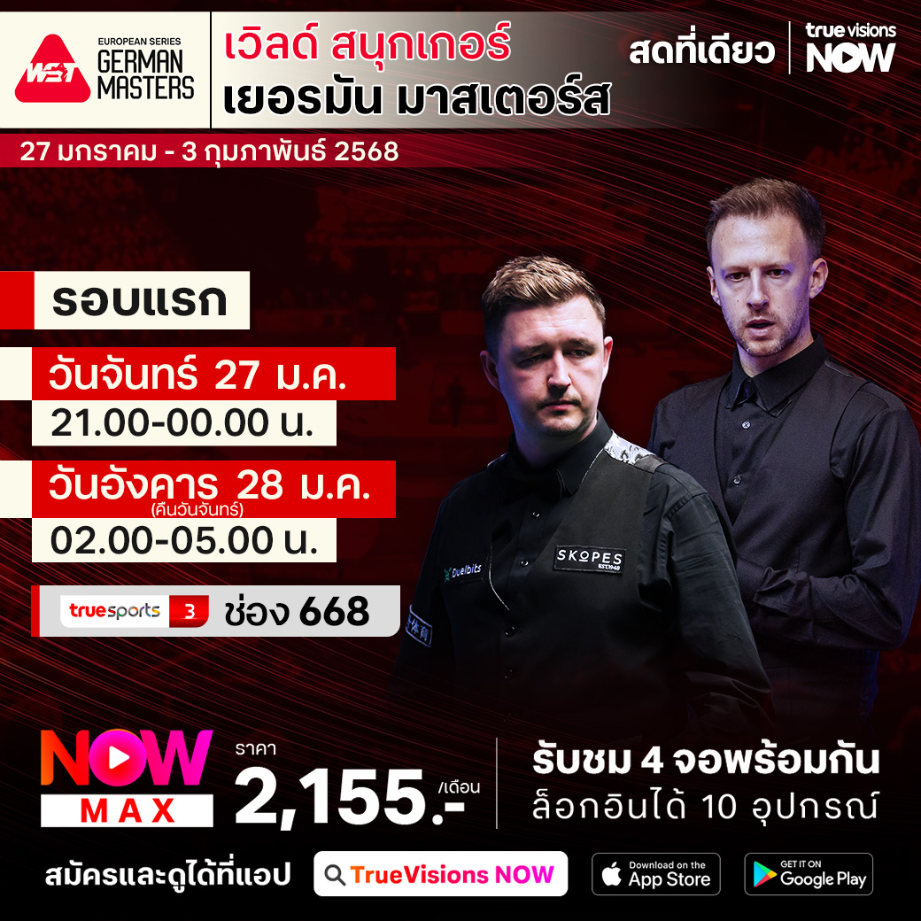 เวิลด์ สนุกเกอร์ ทัวร์ รายการเก็บคะแนนสะสมโลก ฤดูกาล 2024/25 สัปดาห์นี้ ไปกันที่เมืองเบียร์ กับรายการ เยอรมัน มาสเตอร์ส สดจากสังเวียน เทนโปโดรม กรุงเบอร์ลิน ประเทศเยอรมนี มือท็อปๆ ของ เวิลด์ แรงค์กิ้ง นำทีมลุ้นโทรฟี่กันคับคั่ง ชมสด ครบทุกรอบ เอ็กซ์คลูซีฟ ที่เดียวที่ ทรูวิชั่นส์