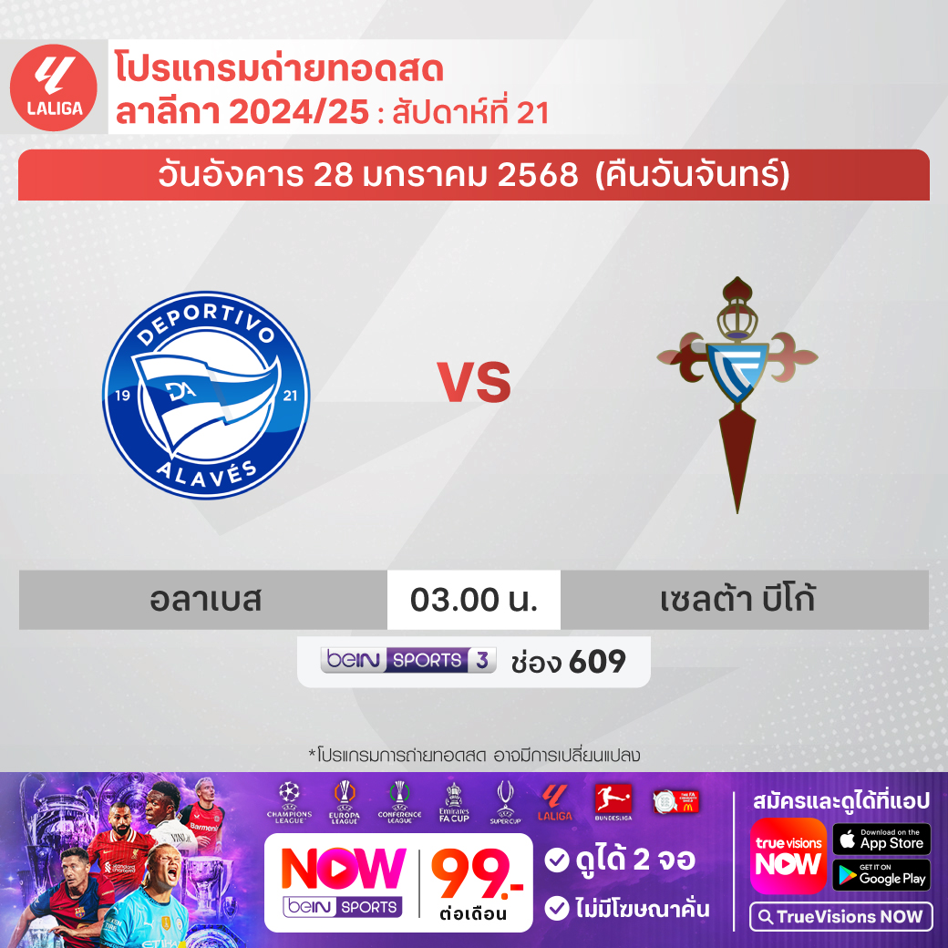 Alaves vs Celta Vigo เวลา 03.00-05.00 ทางช่อง beIN 3 (609)