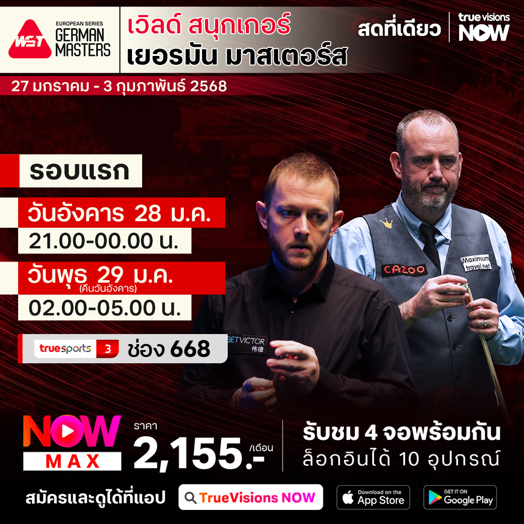 เวิลด์ สนุกเกอร์ ทัวร์ รายการเก็บคะแนนสะสมโลก ฤดูกาล 2024/25 สัปดาห์นี้ ไปกันที่เมืองเบียร์ กับรายการ เยอรมัน มาสเตอร์ส สดจากสังเวียน เทนโปโดรม กรุงเบอร์ลิน ประเทศเยอรมนี มือท็อปๆ ของ เวิลด์ แรงค์กิ้ง นำทีมลุ้นโทรฟี่กันคับคั่ง ชมสด ครบทุกรอบ เอ็กซ์คลูซีฟ ที่เดียวที่ ทรูวิชั่นส์