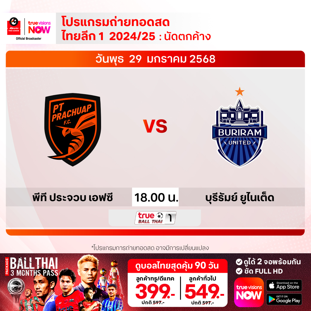 พีที ประจวบ เอฟซี พบ บุรีรัมย์ ยูไนเต็ด เวลา 18.00-20.00 ทางช่อง True Ball Thai 1