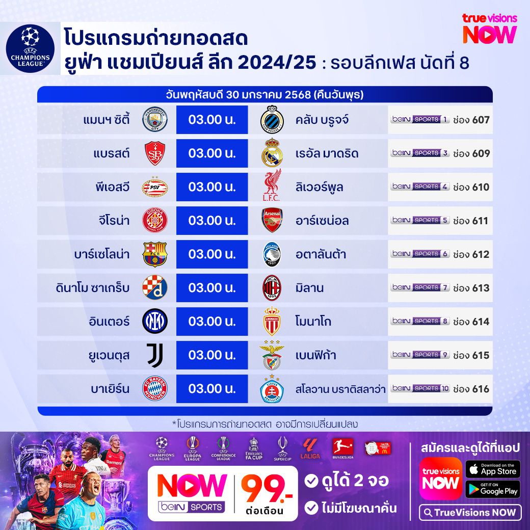 Man City vs Club Brugge เวลา 03.00-05.00 ทางช่อง beIN 1 (607)