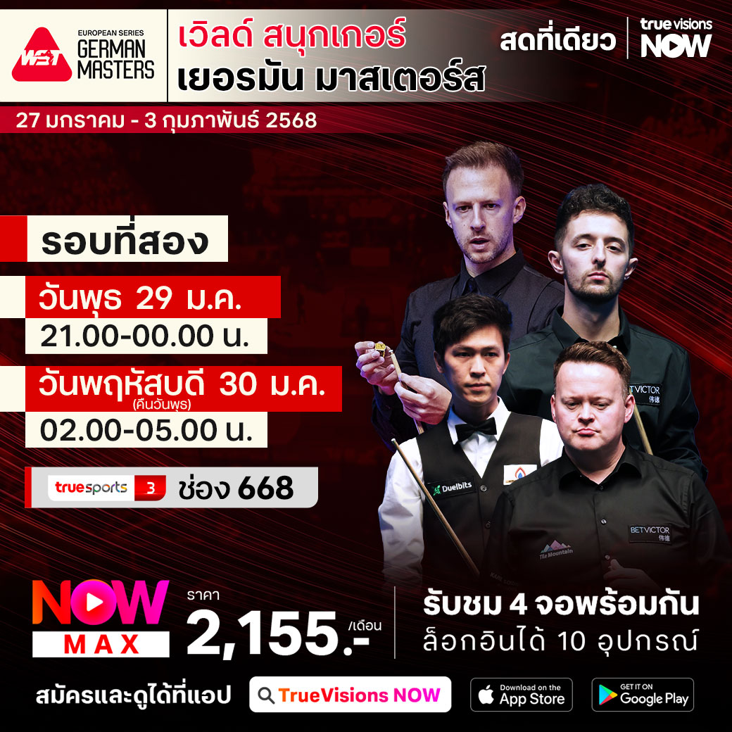 เวิลด์ สนุกเกอร์ ทัวร์ รายการเก็บคะแนนสะสมโลก ฤดูกาล 2024/25 สัปดาห์นี้ ไปกันที่เมืองเบียร์ กับรายการ เยอรมัน มาสเตอร์ส สดจากสังเวียน เทนโปโดรม กรุงเบอร์ลิน ประเทศเยอรมนี มือท็อปๆ ของ เวิลด์ แรงค์กิ้ง นำทีมลุ้นโทรฟี่กันคับคั่ง ชมสด ครบทุกรอบ เอ็กซ์คลูซีฟ ที่เดียวที่ ทรูวิชั่นส์