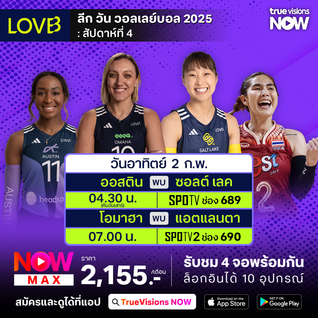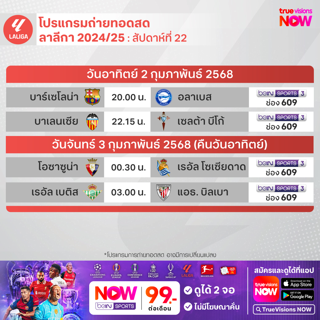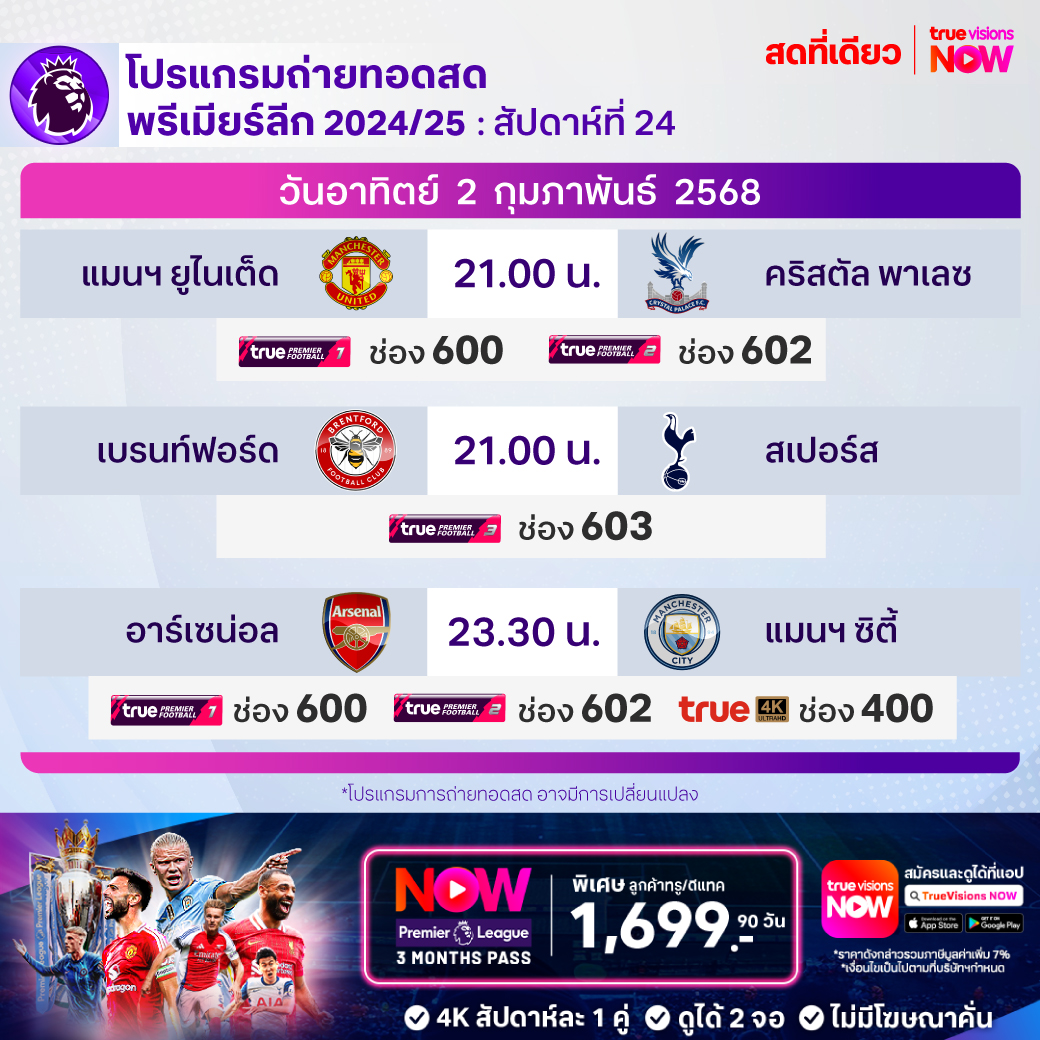 วันนี้มีอะไรดูที่ ทรูวิชั่นส์ ประจำวันอาทิตย์ที่ 2 กุมภาพันธ์ 68 ยังคงมีกีฬาที่น่าสนใจให้ได้ตามลุ้นตามเชียร์กันเหมือนเดิม โดยในส่วนของฟุตบอลยังมีศึกพรีเมียร์ลีก อังกฤษ, บุนเดสลีกา เยอรมนี, ลา ลีกา สเปน และ ไทยลีก 1, 2 ให้ได้ตามเชียร์กันต่อเนื่อง ส่วนกีฬาอื่นๆ ยังมีเทนนิส เดวิส คัพ 2025 รอบคัดเลือก, เทนนิสหญิง ดับเบิ้ลยูทีเอ ทัวร์ รายการ ออสเตรีย เลดี้ส์ ลินซ์ และรายการ สิงคโปร์ เทนนิส โอเพ่น นอกจากนี้ยังมีกอล์ฟ พีจีเอ ทัวร์ รายการ เอทีแอนด์ที เพ็บเบิ้ล บีช โปร-แอม, ดีพี เวิลด์ ทัวร์ รายการ บาห์เรน แชมเปี้ยนชิพ, แบดมินตัน บีดับเบิ้ลยูเอฟ รายการ ปรินเซส สิริวัณณวรี ไทยแลนด์ มาสเตอร์ส, เวิลด์ สนุกเกอร์ ทัวร์ รายการ เยอรมัน มาสเตอร์ส, วอลเลย์บอลแอลโอวีบี, วอลเลย์บอลเอสวีลีก, บาสเกตบอลเอ็นบีเอ และ อเมริกันฟุตบอลเอ็นเอฟแอล โปร โบล์ว 2024/25 งานนี้ ทรูวิชั่นส์ จัดเต็มให้ชมกันถึงบ้าน