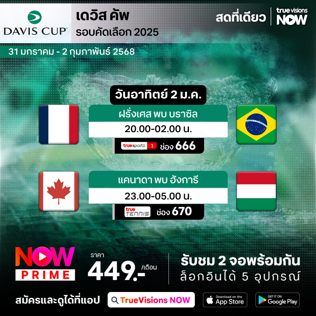 การแข่งขันเทนนิสชายประเภททีมกลับมาอีกครั้ง กับการแข่งขันเทนนิส เดวิส คัพ 2025 รอบคัดเลือก โดยในรอบนี้ ทรูวิชั่นส์จะถ่ายทอดสดจากทั่วทุกมุมโลกให้ได้ติดตามชม ร่วมลุ้นกันว่าชาติไหนจะได้ผ่านเข้ารอบถัดไป