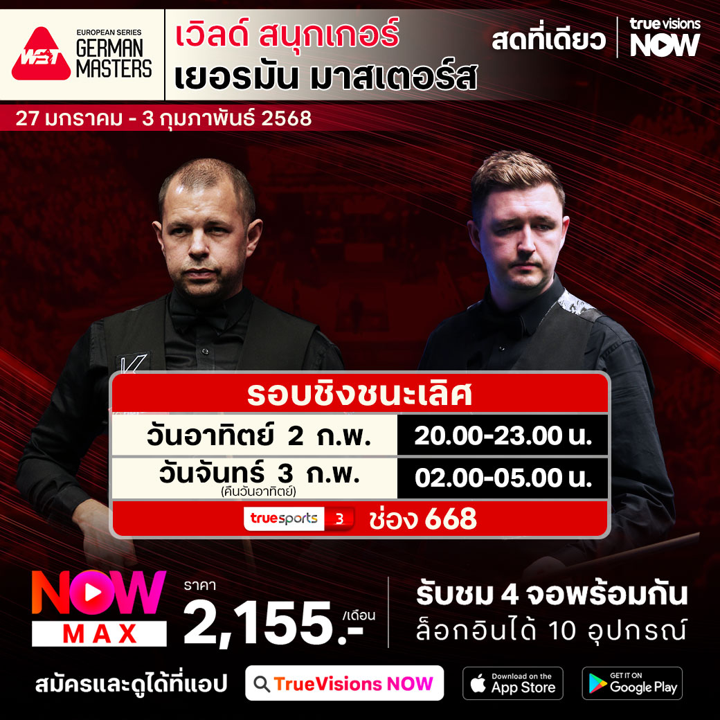 เวิลด์ สนุกเกอร์ ทัวร์ รายการเก็บคะแนนสะสมโลก ฤดูกาล 2024/25 สัปดาห์นี้ ไปกันที่เมืองเบียร์ กับรายการ เยอรมัน มาสเตอร์ส สดจากสังเวียน เทนโปโดรม กรุงเบอร์ลิน ประเทศเยอรมนี มือท็อปๆ ของ เวิลด์ แรงค์กิ้ง นำทีมลุ้นโทรฟี่กันคับคั่ง ชมสด ครบทุกรอบ เอ็กซ์คลูซีฟ ที่เดียวที่ ทรูวิชั่นส์