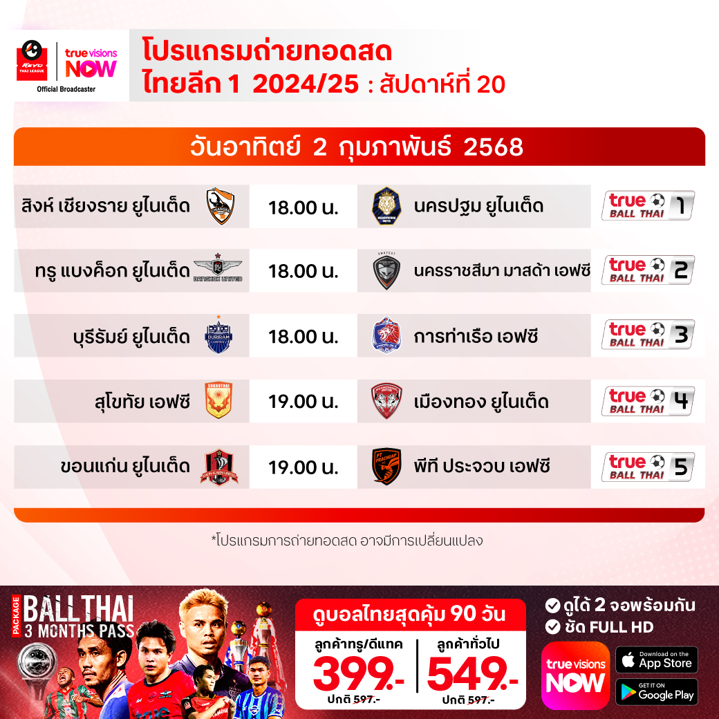 สิงห์ เชียงราย ยูไนเต็ด พบ นครปฐม ยูไนเต็ด เวลา 18.00-20.00 ทางช่อง True Ball Thai 1
