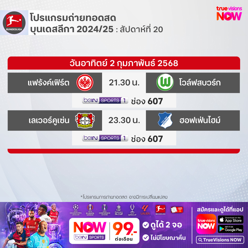 Leverkusen vs Hoffenheim เวลา 23.30-01.30 ทางช่อง beIN 1 (607)