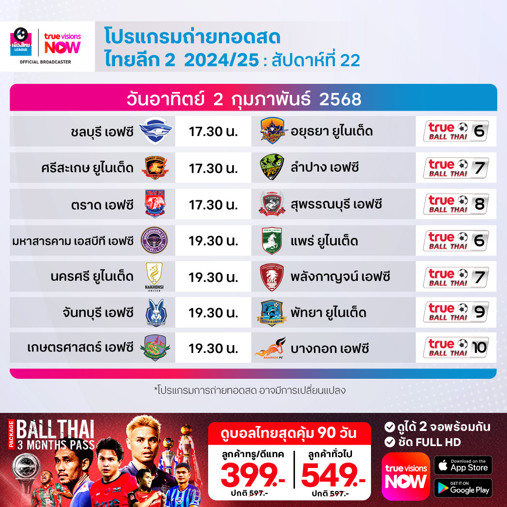 จันทบุรี เอฟซี พบ พัทยา ยูไนเต็ด เวลา 19.30-21.30 ทางช่อง True Ball Thai 9