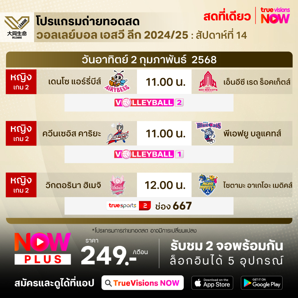 เดนโซ แอร์รี่บีส์ พบ เอ็นอีซี เรด ร็อคเก็ตส์ ` เวลา 11.00 - 13.30 ทางช่อง Volleyball 2