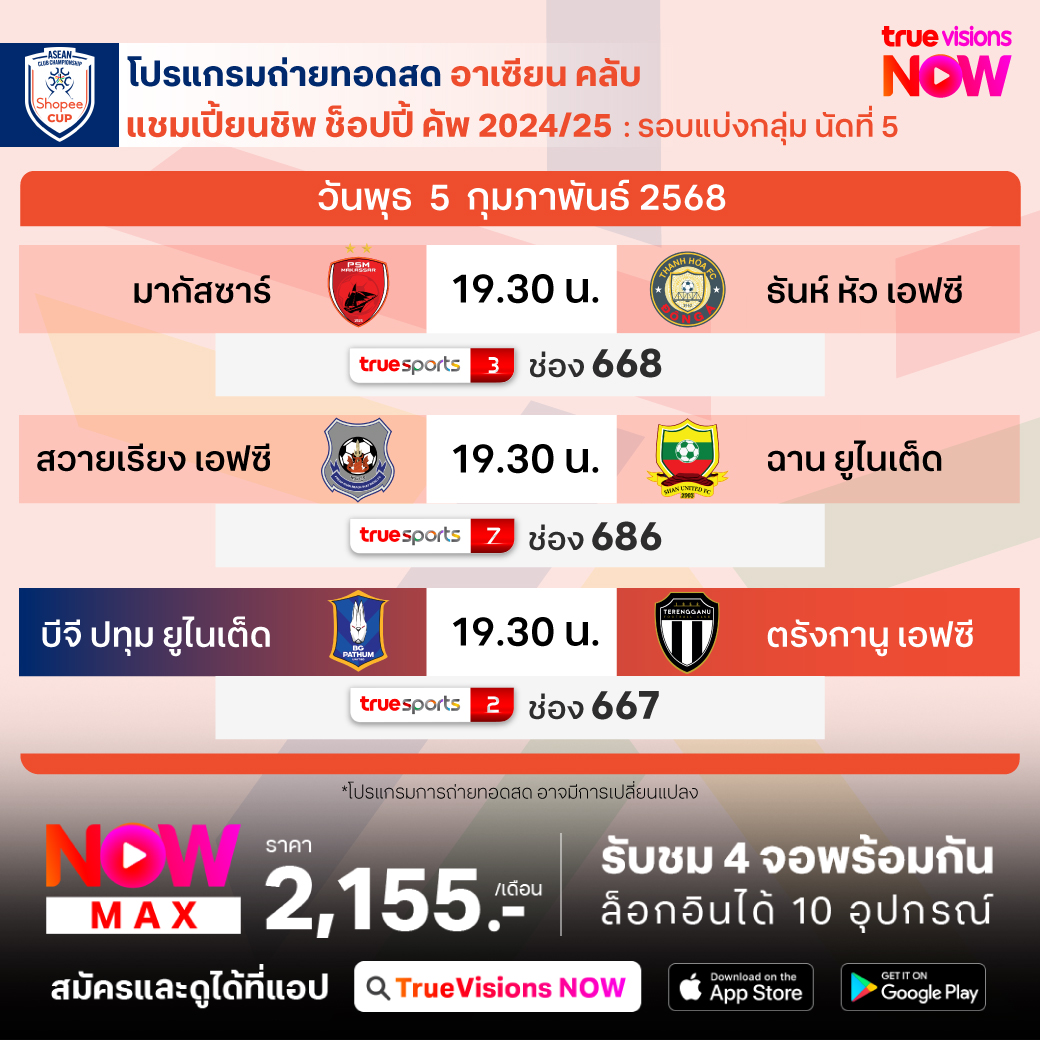 วันนี้มีอะไรดูที่ ทรูวิชั่นส์ ประจำวันพุธที่ 5 กุมภาพันธ์ 68 ยังคงมีกีฬาที่น่าสนใจให้ได้ตามลุ้นตามเชียร์กันเหมือนเดิม โดยในส่วนของฟุตบอลนั้นยังมีศึก รีโว่ คัพ และ อาเซียน คลับ แชมเปี้ยนชิพ ช็อปปี้ คัพ ให้ได้ตามเชียร์กันต่อ ส่วนกีฬาอื่นๆ ยังมีเทนนิส เอทีพี ทัวร์ รายการ ร็อตเตอร์ดัม โอเพ่น และ ดับเบิ้ลยูทีเอ ทัวร์ รายการ อาบูดาบี โอเพ่น, กอล์ฟ ลีก 2025 และ บาสเกตบอล อีสต์ เอเชีย ซูเปอร์ลีก งานนี้ ทรูวิชั่นส์ จัดเต็มให้ชมกันถึงบ้าน