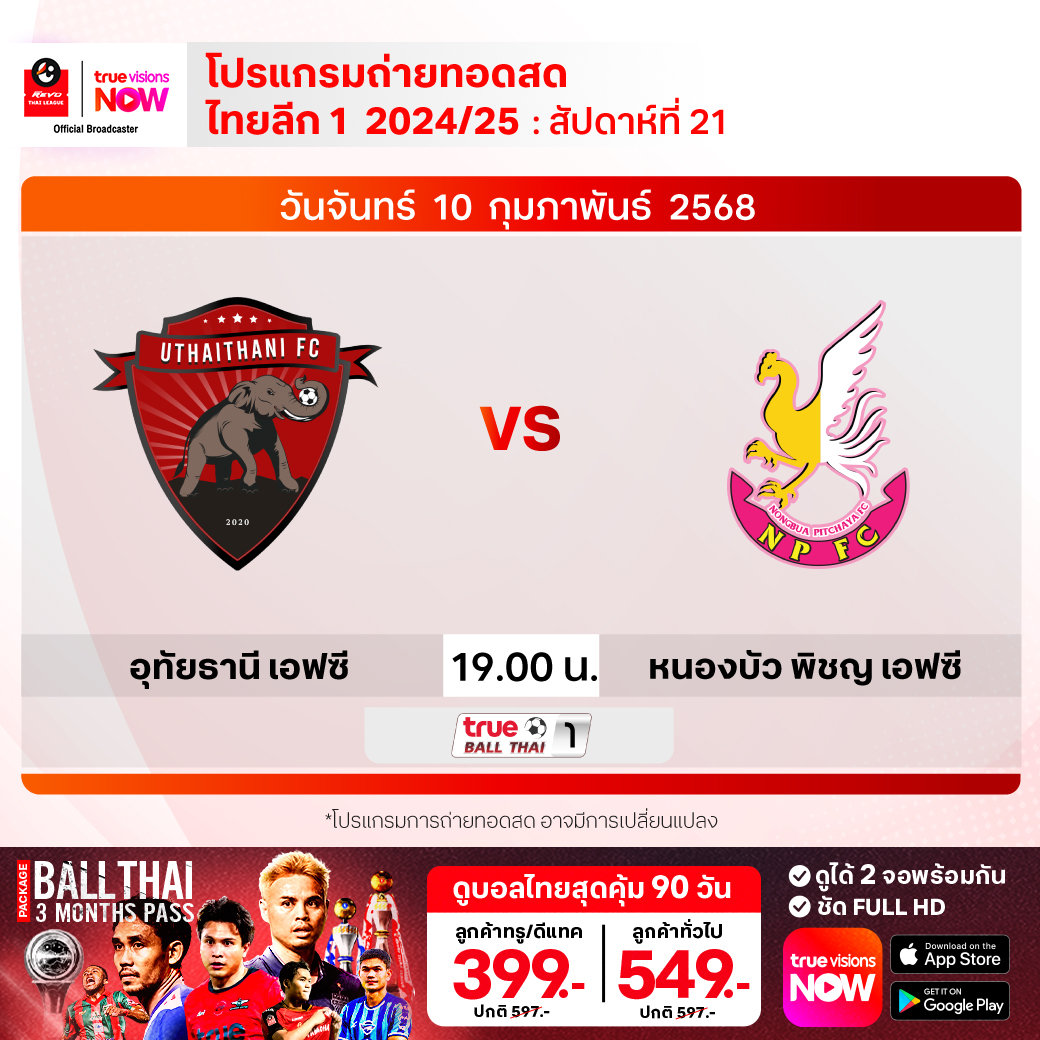 อุทัยธานี เอฟซี พบ หนองบัว พิชญ เอฟซี เวลา 19.00-21.00 ทางช่อง True Ball Thai 1