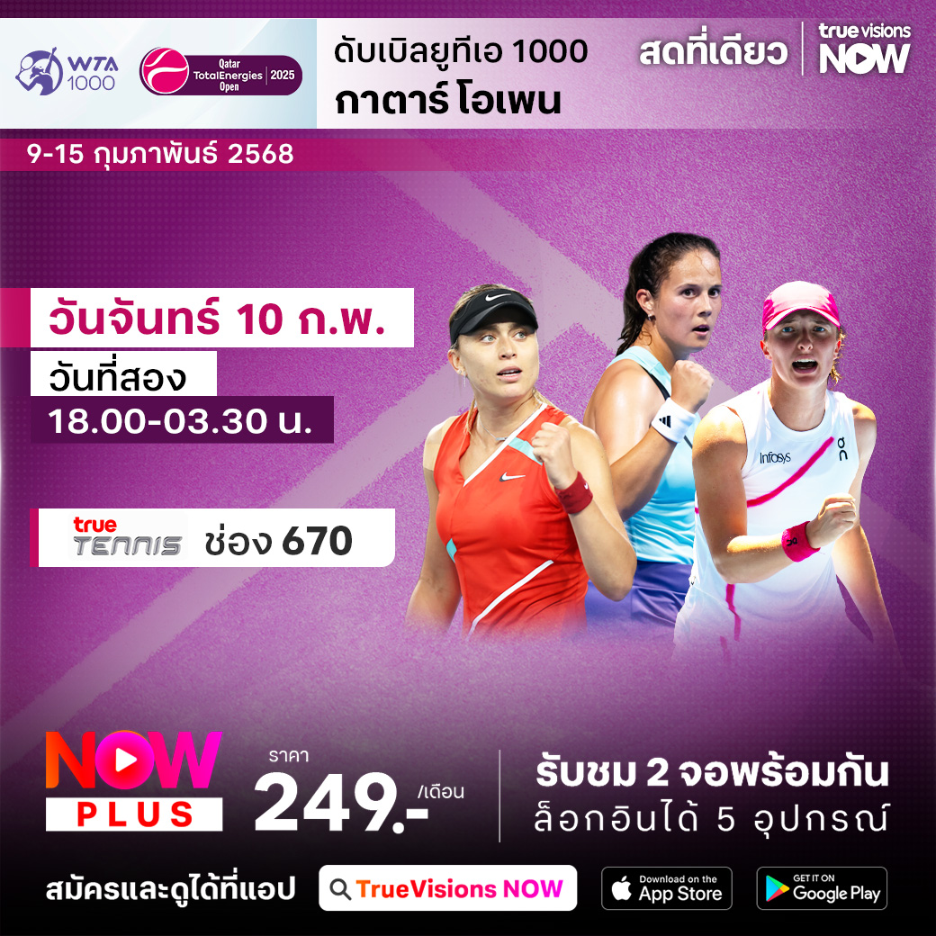 เทนนิสหญิง ดับเบิ้ลยูทีเอ ทัวร์ ช่วงการแข่งขันในภูมิภาคตะวันออกกลาง สัปดาห์นี้พบกับรายการ กาตาร์ โอเพ่น รายการใหญ่ระดับ WTA 1000 หนึ่งในรายการที่สำคัญที่สุดบนตารางการแข่งขันในทุกปี โดยรายการนี้มีนักเทนนิสหญิงชื่อดังระดับโลกเข้าร่วมกันอย่างคับคั่ง ร่วมลุ้นว่าใครจะคว้าแชมป์ไปครอง ชมสด ครบทุกรอบ ที่ ทรูวิชั่นส์
