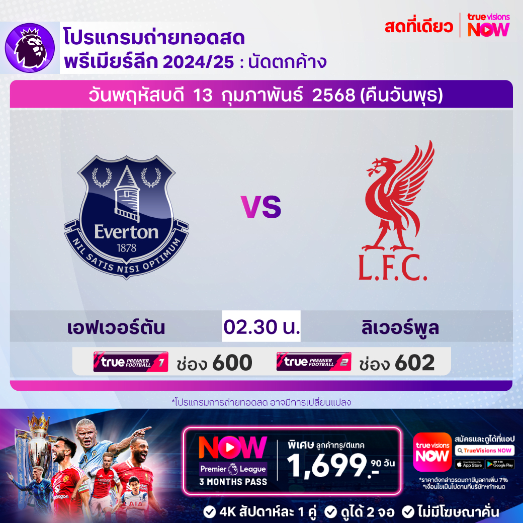 Everton vs Liverpool เวลา 02:30 - 04:30 ทางช่อง TPF 1 (600) / TPF 2 (602)