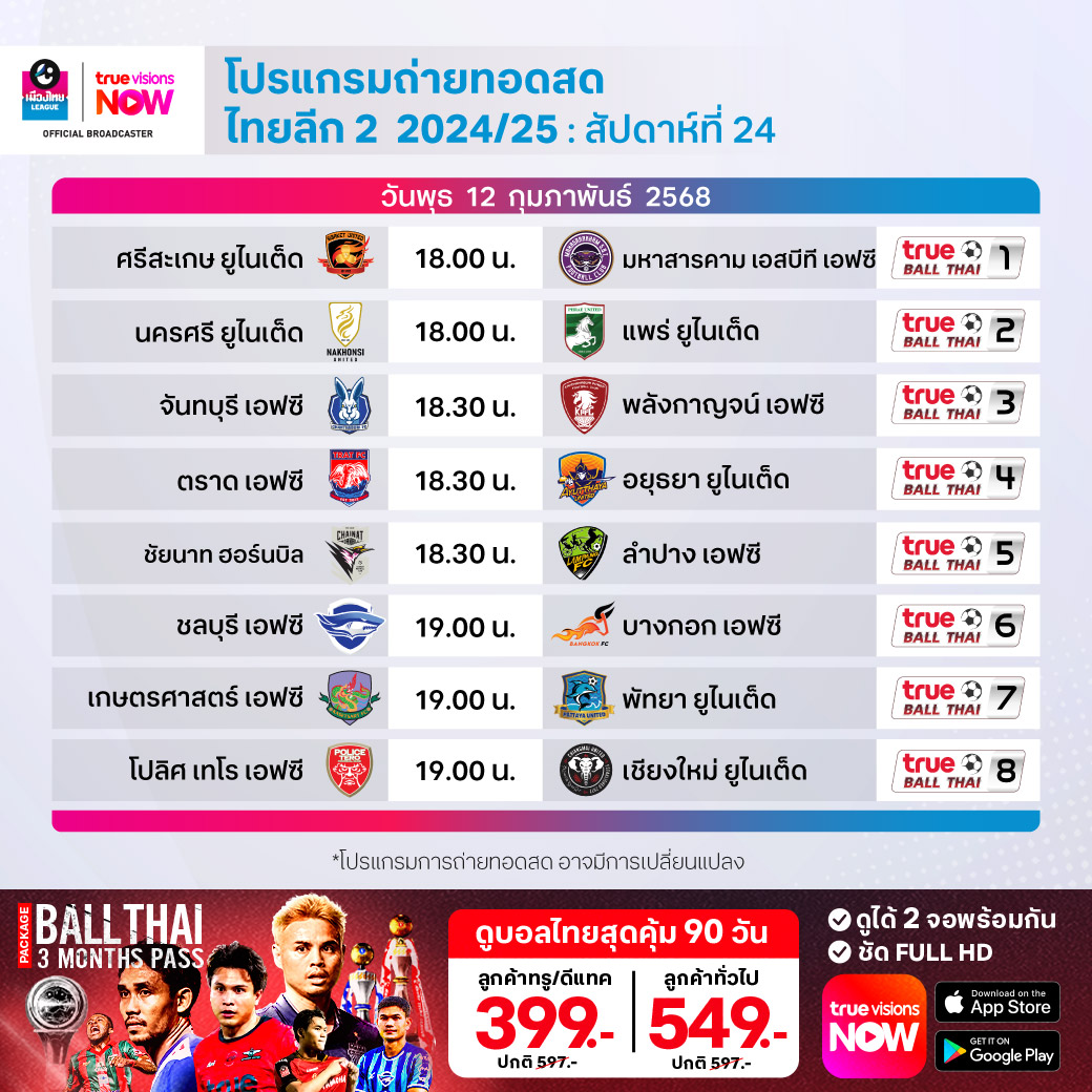 นครศรี ยูไนเต็ด พบ แพร่ ยูไนเต็ด เวลา 18.00-20.00 ทางช่อง True Ball Thai 2