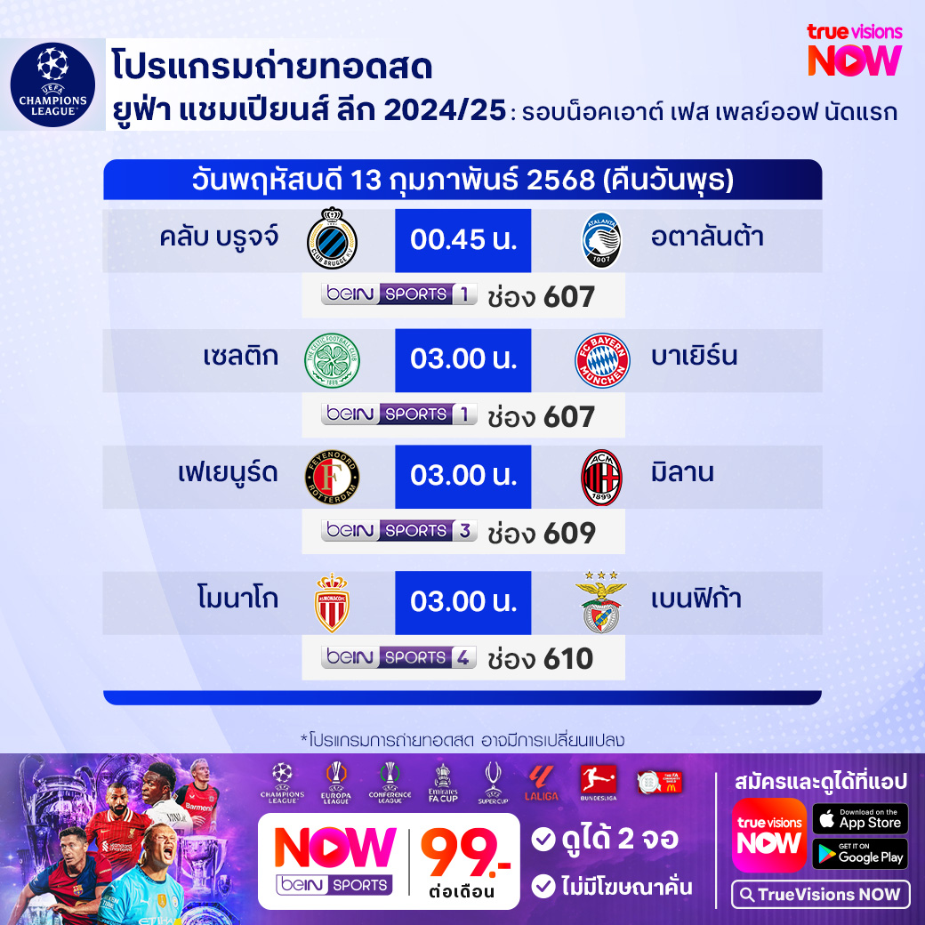 Club Brugge vs Atalanta เวลา 00.45-02.45 ทางช่อง beIN 1 (607)
