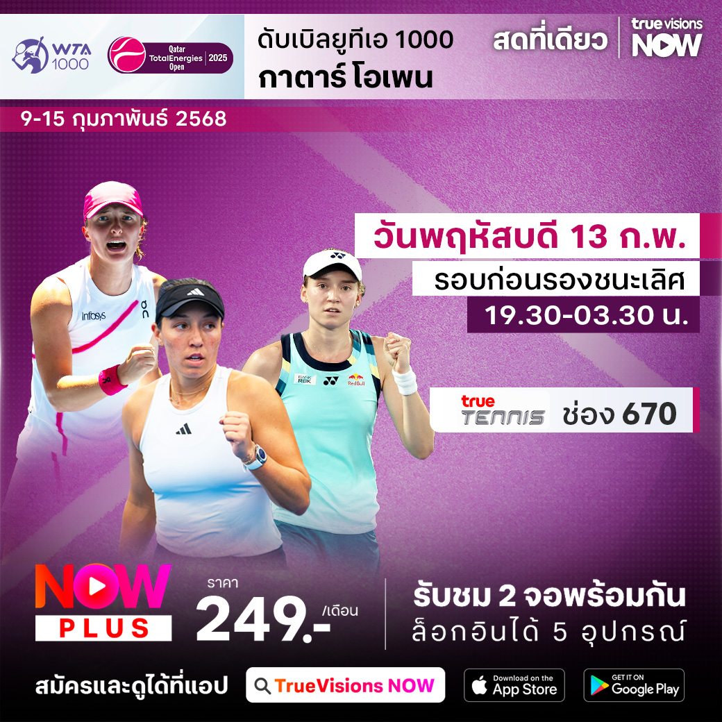 เทนนิสหญิง ดับเบิ้ลยูทีเอ ทัวร์ ช่วงการแข่งขันในภูมิภาคตะวันออกกลาง สัปดาห์นี้พบกับรายการ กาตาร์ โอเพ่น รายการใหญ่ระดับ WTA 1000 หนึ่งในรายการที่สำคัญที่สุดบนตารางการแข่งขันในทุกปี โดยรายการนี้มีนักเทนนิสหญิงชื่อดังระดับโลกเข้าร่วมกันอย่างคับคั่ง ร่วมลุ้นว่าใครจะคว้าแชมป์ไปครอง ชมสด ครบทุกรอบ ที่ ทรูวิชั่นส์