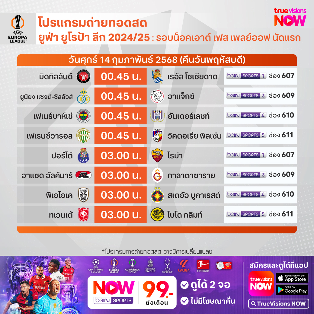 วันนี้มีอะไรดูที่ ทรูวิชั่นส์ ประจำวันพฤหัสบดีที่ 13 กุมภาพันธ์ 68 ยังคงมีกีฬาที่น่าสนใจให้ได้ตามลุ้นตามเชียร์กันเหมือนเดิม โดยในส่วนของฟุตบอลนั้นยังมีศึก ยูฟ่า ยูโรป้า ลีก และ ยูฟ่า คอนเฟอเรนซ์ ลีก รอบ น็อคเอาท์ เฟส เพลย์ออฟ นัดแรก และ ซาอุดิ โปร ลีก ให้ได้ตามเชียร์กันต่อ ส่วนกีฬาอื่นๆ ยังมีเทนนิส เอทีพี ทัวร์ รายการ อาร์เจนติน่า โอเพ่น, ดับเบิ้ลยูทีเอ ทัวร์ รายการ กาตาร์ โอเพ่น, กอล์ฟ พีจีเอ ทัวร์ รายการ เดอะ เจเนซิส อินวิเตชั่นแนล, แบดมินตัน รายการ เอเชีย มิกซ์ ทีม แชมเปี้ยนชิพ และ เวิลด์ สนุกเกอร์ ทัวร์ รายการ เวลช์ โอเพ่น งานนี้ ทรูวิชั่นส์ จัดเต็มให้ชมกันถึงบ้าน