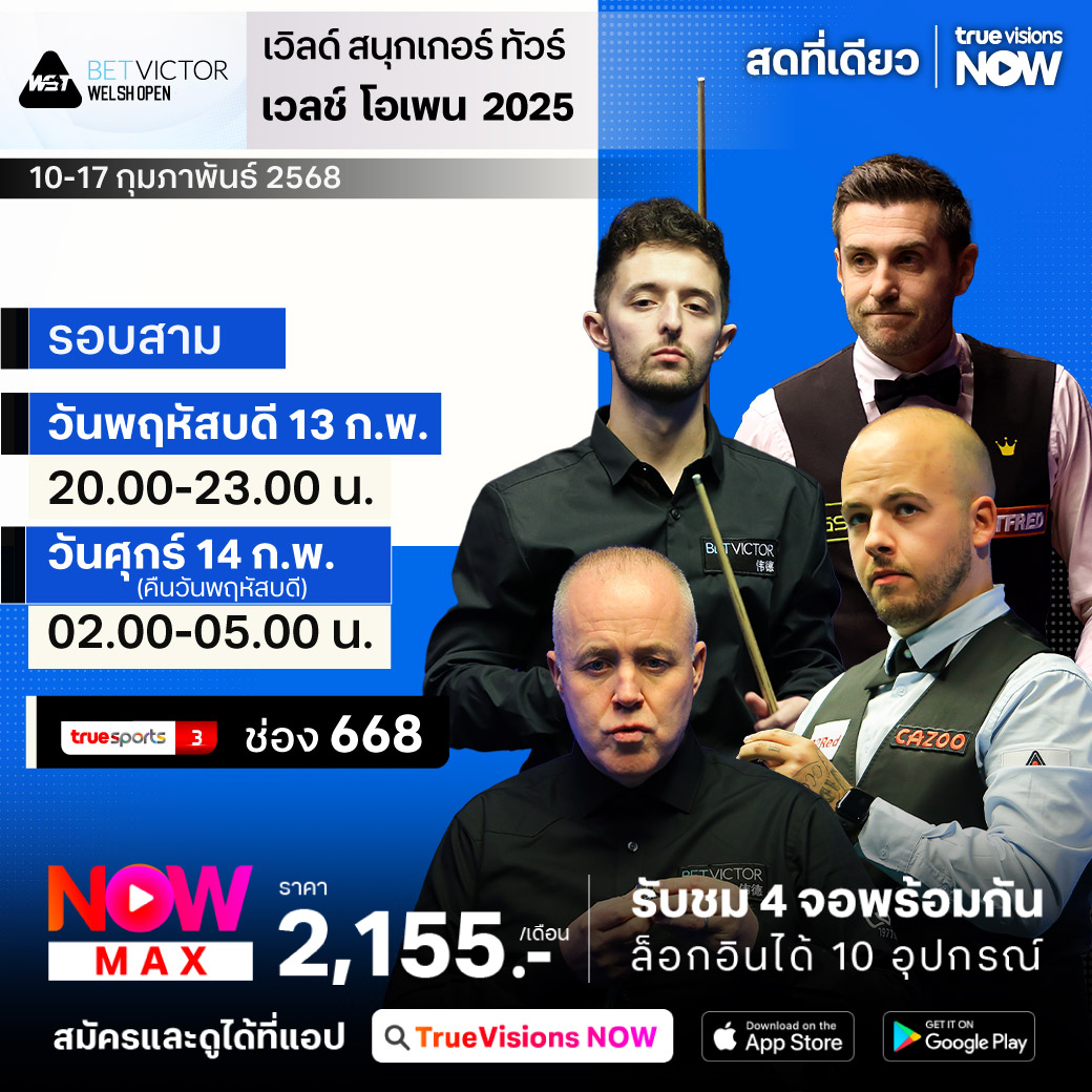 ศึก เวิลด์ สนุกเกอร์ ทัวร์ สัปดาห์นี้พบกับรายการ เวลช์ โอเพ่น 2025 รายการสุดท้ายของ โฮม เนชั่นส์ ซีรี่ส์ ที่สังเวียน เวนูซิมรู ในแคว้นเวลส์ สหราชอาณาจักร นักสอยคิวมือดีระดับท็อปของ เวิลด์ แรงค์กิ้ง ไปร่วมแข่งขันและแย่งแชมป์กันคับคั่ง โดยแชมป์จะได้รับถึง 100,000 ปอนด์ และลุ้นโบนัสอีก 150,000 ปอนด์ สำหรับคะแนนรวมสูงสุดของซีรี่ส์ ชมสด เอ็กซ์คลูซีฟ รอบแรกถึงรอบชิงชนะเลิศ ที่เดียวที่ ทรูวิชั่นส์