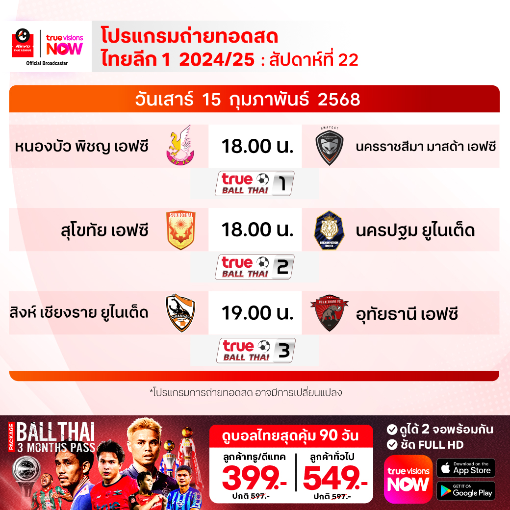 หนองบัว พิชญ เอฟซี พบ นครราชสีมา มาสด้า เอฟซี เวลา 18.00-20.00 ทางช่อง True Ball Thai 1