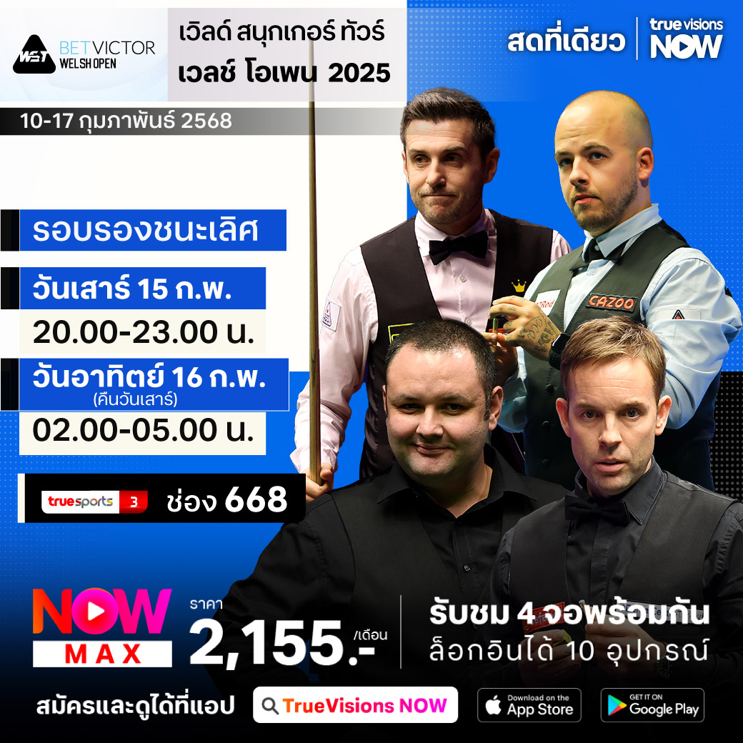 ศึก เวิลด์ สนุกเกอร์ ทัวร์ สัปดาห์นี้พบกับรายการ เวลช์ โอเพ่น 2025 รายการสุดท้ายของ โฮม เนชั่นส์ ซีรี่ส์ ที่สังเวียน เวนูซิมรู ในแคว้นเวลส์ สหราชอาณาจักร นักสอยคิวมือดีระดับท็อปของ เวิลด์ แรงค์กิ้ง ไปร่วมแข่งขันและแย่งแชมป์กันคับคั่ง โดยแชมป์จะได้รับถึง 100,000 ปอนด์ และลุ้นโบนัสอีก 150,000 ปอนด์ สำหรับคะแนนรวมสูงสุดของซีรี่ส์ ชมสด เอ็กซ์คลูซีฟ รอบแรกถึงรอบชิงชนะเลิศ ที่เดียวที่ ทรูวิชั่นส์