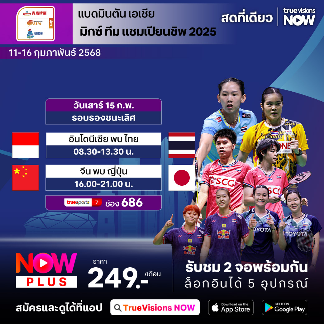พักรบเรื่องเก็บคะแนนสะสมโลกและมาเอาใจช่วยทีมชาติ กับศึกแห่งศักดิ์ศรีระดับชิงแชมป์ทวีป สัปดาห์นี้ แฟนๆ กีฬาแบดมินตันจะได้สัมผัสบรรยากาศของความสนุกตื่นเต้น ในรูปแบบของทีมผสมชิงแชมป์เอเชีย หรือ เอเชีย มิกซ์ ทีม แชมเปี้ยนชิพ 2025 ที่เมืองชิงเต่า ประเทศจีน ร่วมส่งใจเชียร์ทีมชาติไทย สู้สุดใจเพื่อคว้าชัยเหนือคู่แข่งระดับโลกของเอเชีย ชมสด จุใจ เอ็กซ์คลูซีฟ ที่เดียวที่ ทรูวิชั่นส์
