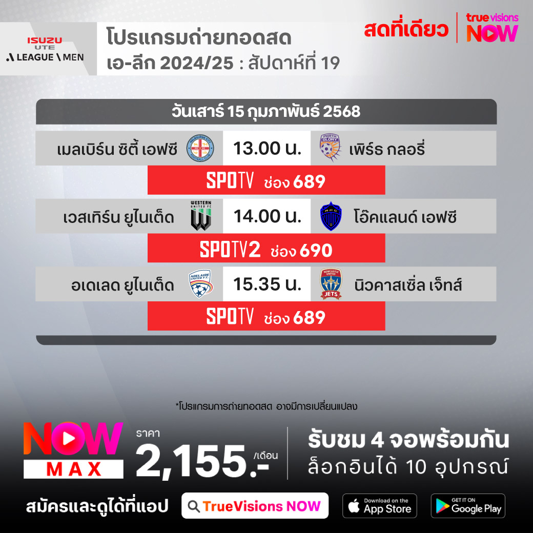 Adelaide United vs Newcastle Jets เวลา 15.35-17.35 ทางช่อง SPOTV (689)