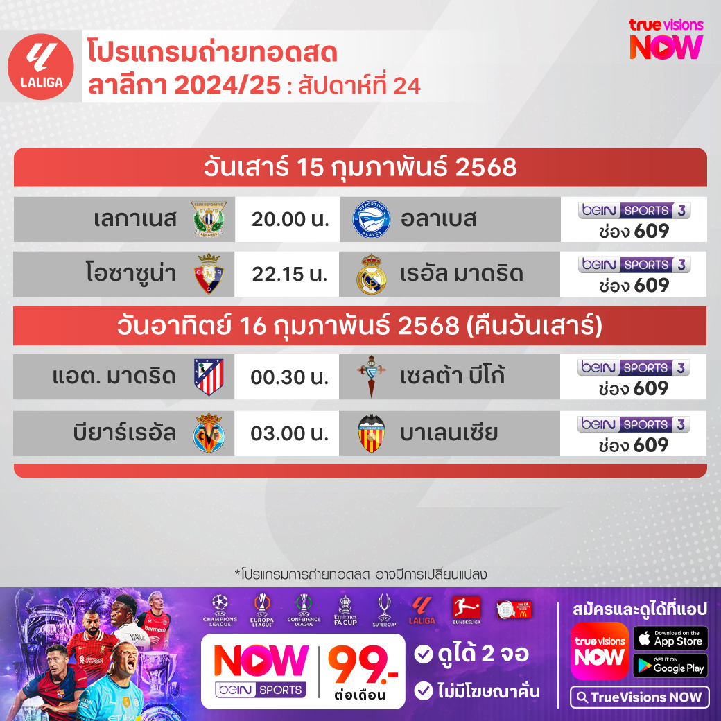 วันนี้มีอะไรดูที่ ทรูวิชั่นส์ ประจำวันเสาร์ที่ 15 กุมภาพันธ์ 68 ยังคงมีกีฬาที่น่าสนใจให้ได้ตามลุ้นตามเชียร์กันเหมือนเดิม โดยในส่วนของฟุตบอลนั้นยังมีศึกพรีเมียร์ลีก อังกฤษ, บุนเดสลีกา เยอรมนี, ลา ลีกา สเปน, เอ-ลีก ออสเตรเลีย, ซาอุดิ โปร ลีก และ ไทยลีก 1, 2 ให้ได้ตามเชียร์กันต่อ ส่วนกีฬาอื่นๆ ยังมีเทนนิส เอทีพี ทัวร์ รายการ อาร์เจนติน่า โอเพ่น, ดับเบิ้ลยูทีเอ ทัวร์ รายการ กาตาร์ โอเพ่น, กอล์ฟ พีจีเอ ทัวร์ รายการ เดอะ เจเนซิส อินวิเตชั่นแนล, ลิฟ กอล์ฟ แอดดิเลด, แบดมินตัน รายการ เอเชีย มิกซ์ ทีม แชมเปี้ยนชิพ, เวิลด์ สนุกเกอร์ ทัวร์ รายการ เวลช์ โอเพ่น, ยูเอฟซี ไฟต์ ไนท์, วอลเลย์บอล แอลโอวีบี และ เอสวีลีก และ บาสเกตบอลเอ็นบีเอ งานนี้ ทรูวิชั่นส์ จัดเต็มให้ชมกันถึงบ้าน