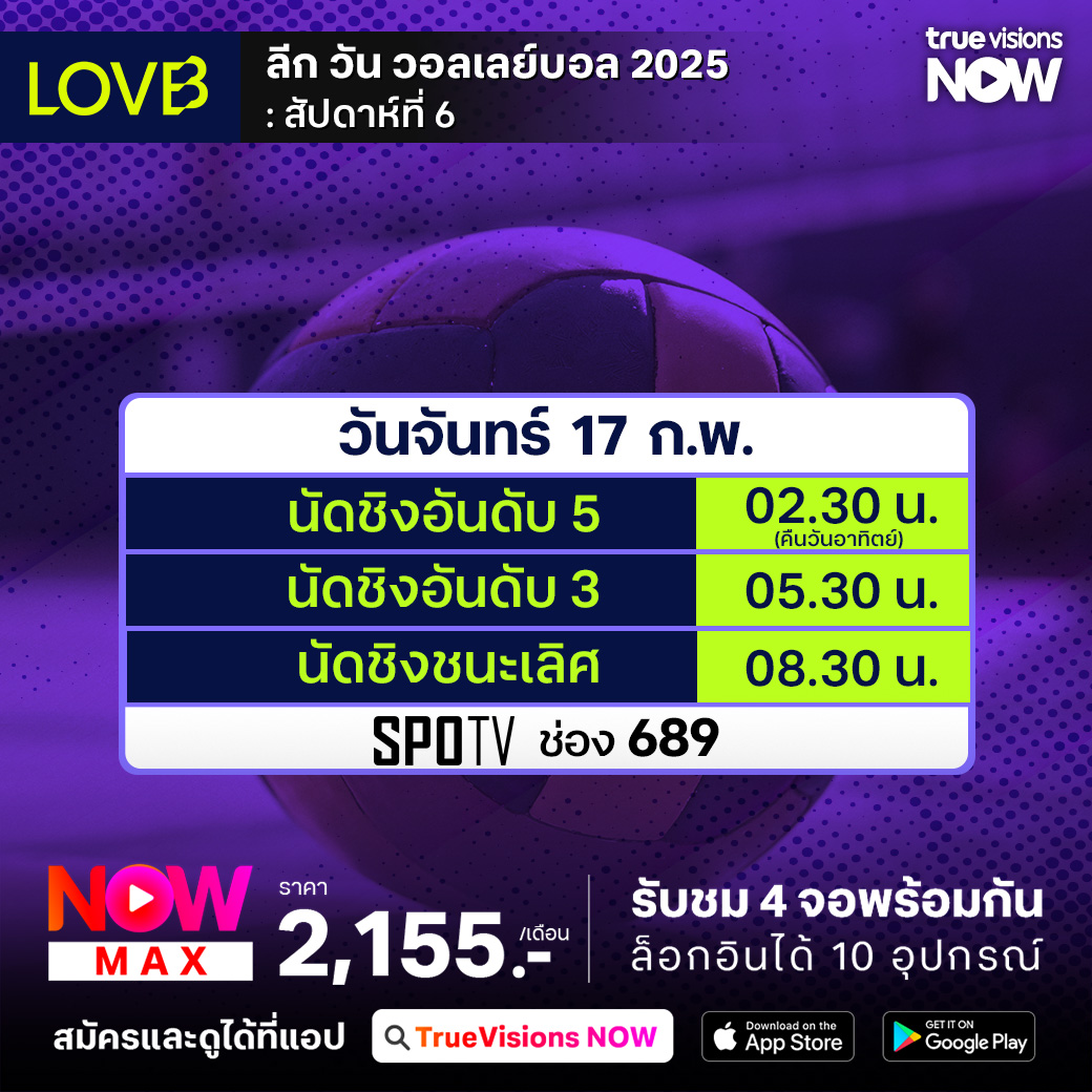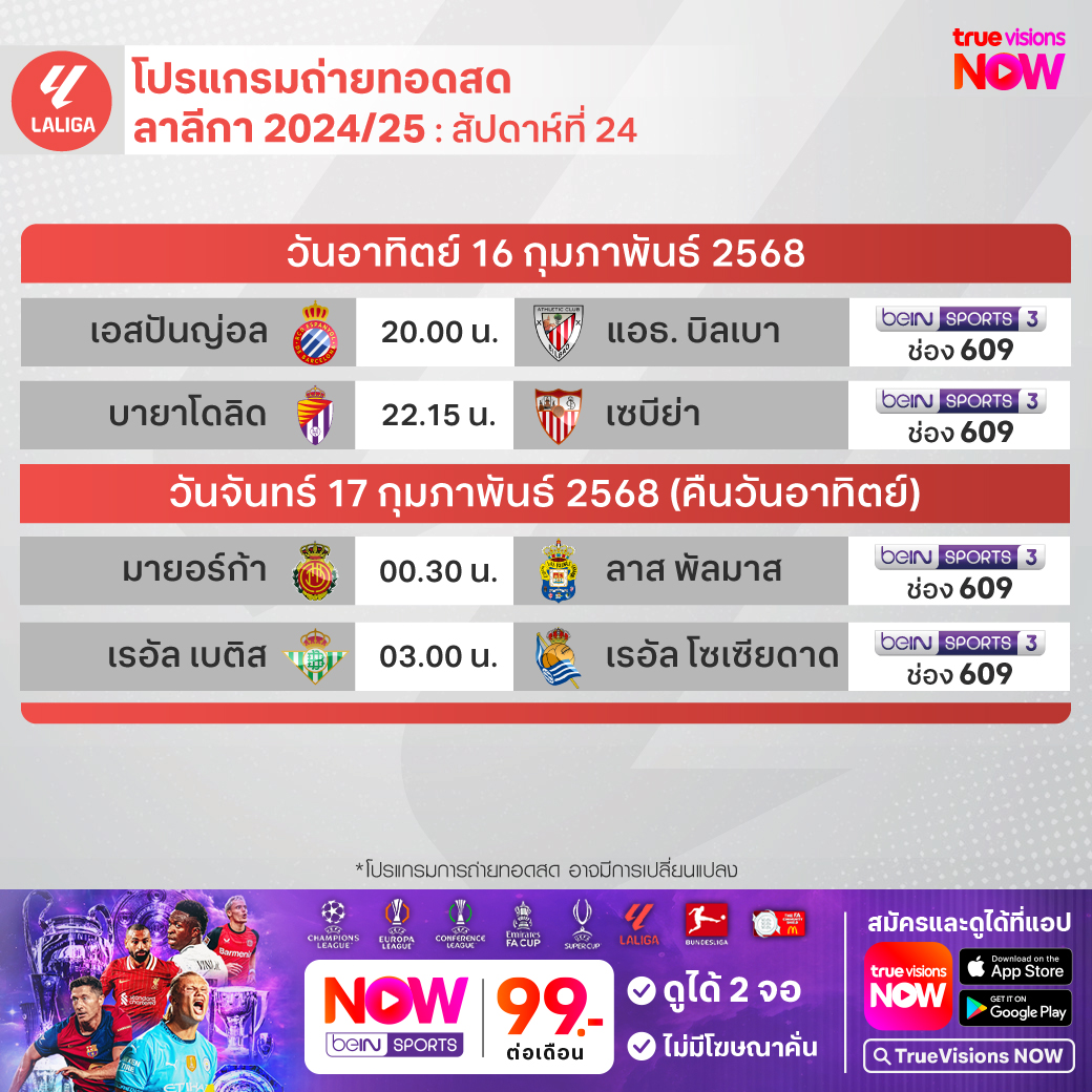 วันนี้มีอะไรดูที่ ทรูวิชั่นส์ ประจำวันอาทิตย์ที่ 16 กุมภาพันธ์ 68 ยังคงมีกีฬาที่น่าสนใจให้ได้ตามลุ้นตามเชียร์กันเหมือนเดิม โดยในส่วนของฟุตบอลนั้นยังมีศึกพรีเมียร์ลีก อังกฤษ, บุนเดสลีกา เยอรมนี, ลา ลีกา สเปน, เอ-ลีก ออสเตรเลีย และ ไทยลีก 2 ให้ได้ตามเชียร์กันต่อ ส่วนกีฬาอื่นๆ ยังมีเทนนิส เอทีพี ทัวร์ รายการ อาร์เจนติน่า โอเพ่น, ดับเบิ้ลยูทีเอ ทัวร์ รายการ ดูไบ ดิวตี้ ฟรี เทนนิส, กอล์ฟ พีจีเอ ทัวร์ รายการ เดอะ เจเนซิส อินวิเตชั่นแนล, ลิฟ กอล์ฟ แอดดิเลด, แบดมินตัน รายการ เอเชีย มิกซ์ ทีม แชมเปี้ยนชิพ, เวิลด์ สนุกเกอร์ ทัวร์ รายการ เวลช์ โอเพ่น, วอลเลย์บอล แอลโอวีบี และ เอสวีลีก และ บาสเกตบอลเอ็นบีเอ งานนี้ ทรูวิชั่นส์ จัดเต็มให้ชมกันถึงบ้าน