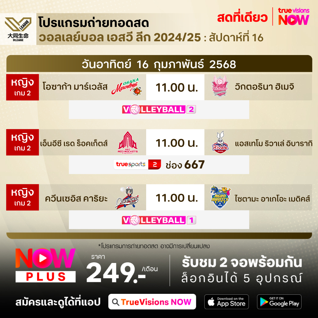 ควีนเซอิส คาริยะ พบ ไซตามะ อาเกโอะ เมดิคส์ เวลา 11.00 - 13.30 ทางช่อง Volleyball 1
