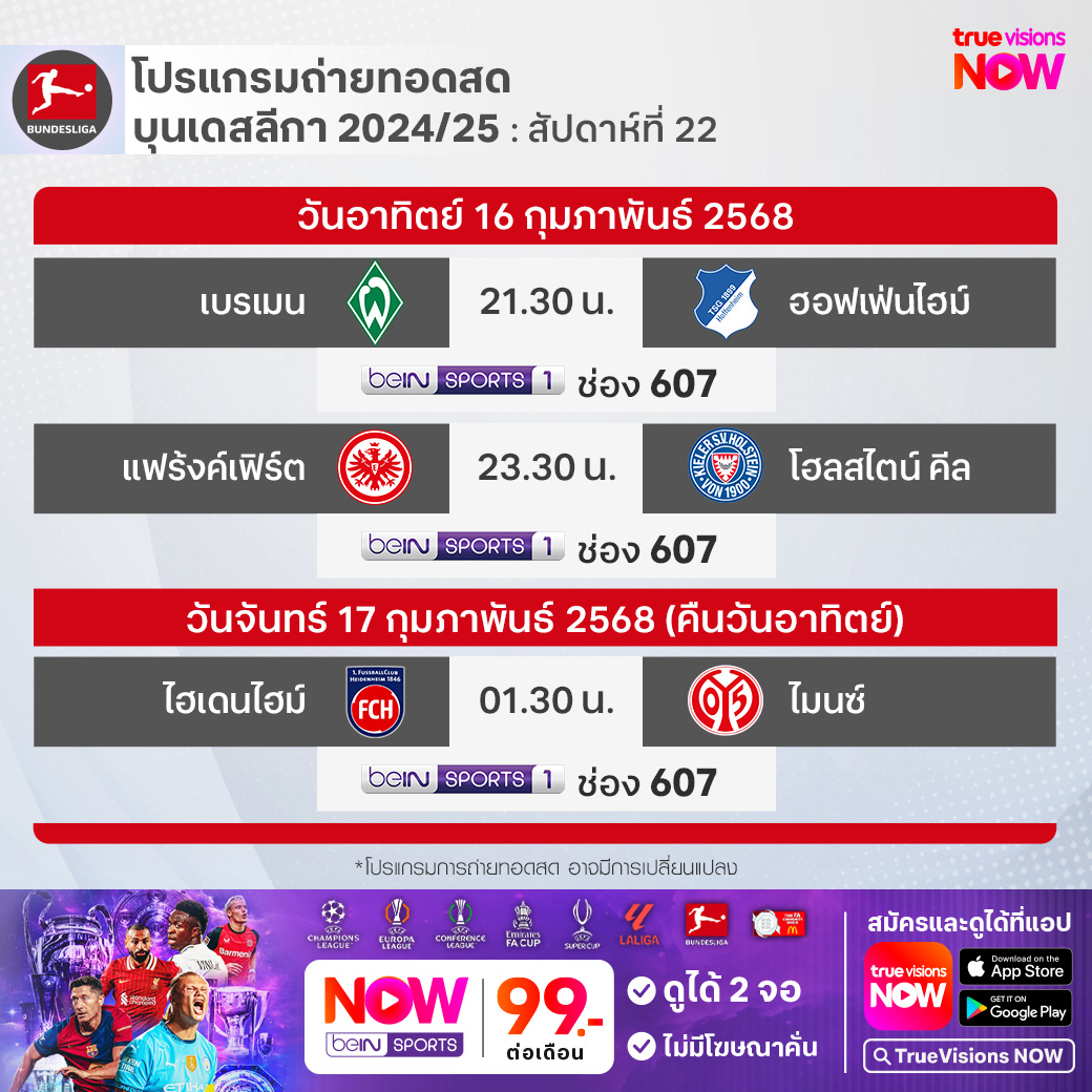 Werder Bremen vs Hoffenheim เวลา 21.30-23.30 ทางช่อง beIN 1 (607)