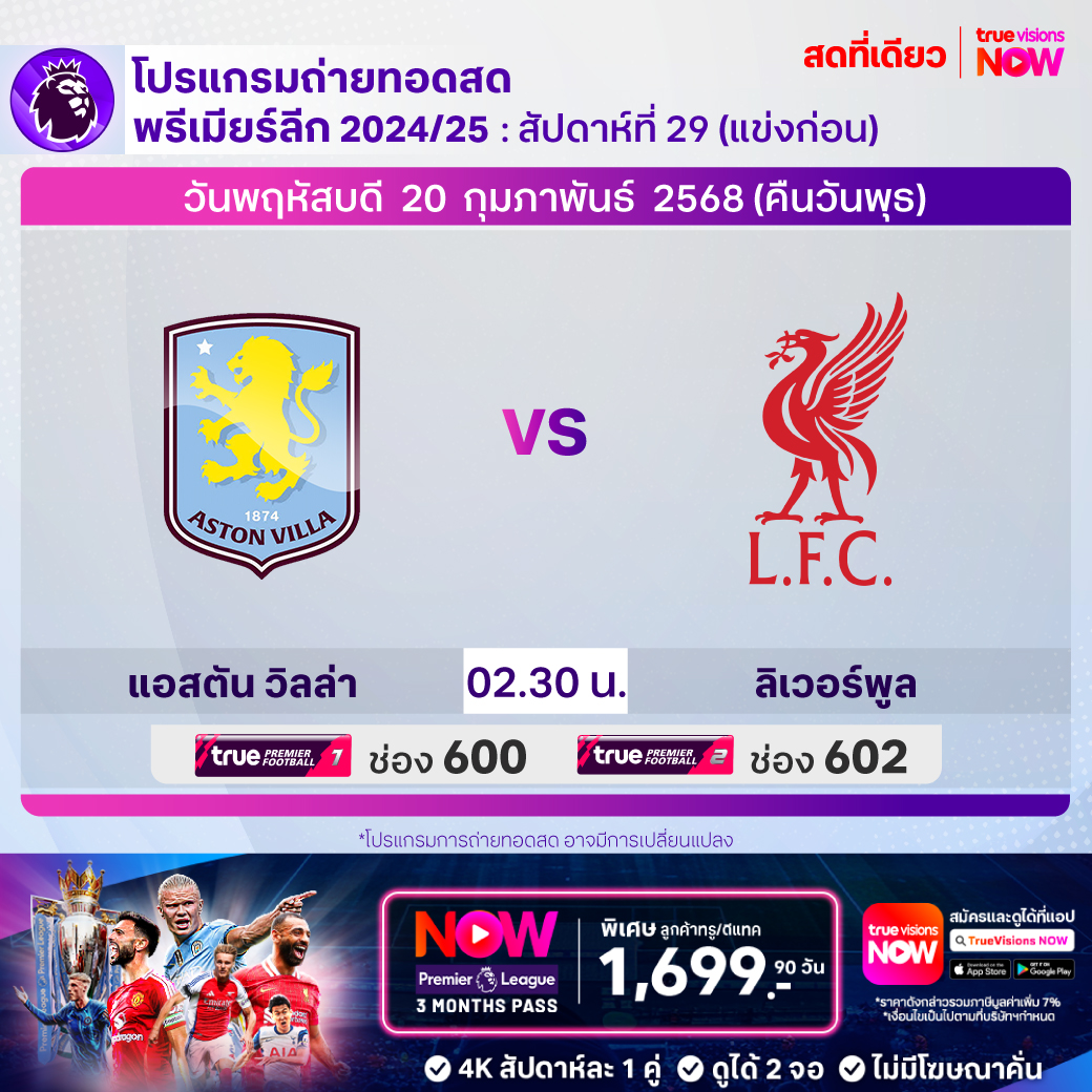 Aston Villa vs Liverpool เวลา 02:30 - 04:30 ทางช่อง TPF 1 (600) / TPF 2 (602)