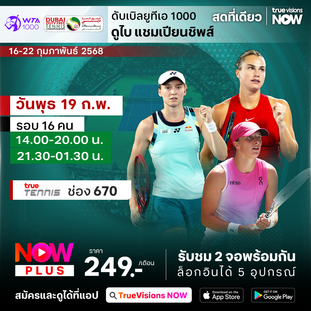 รอบ 16 คน เวลา 14.00 - 20.00 / 21.30 - 01.30 ทางช่อง True Tennis (670)