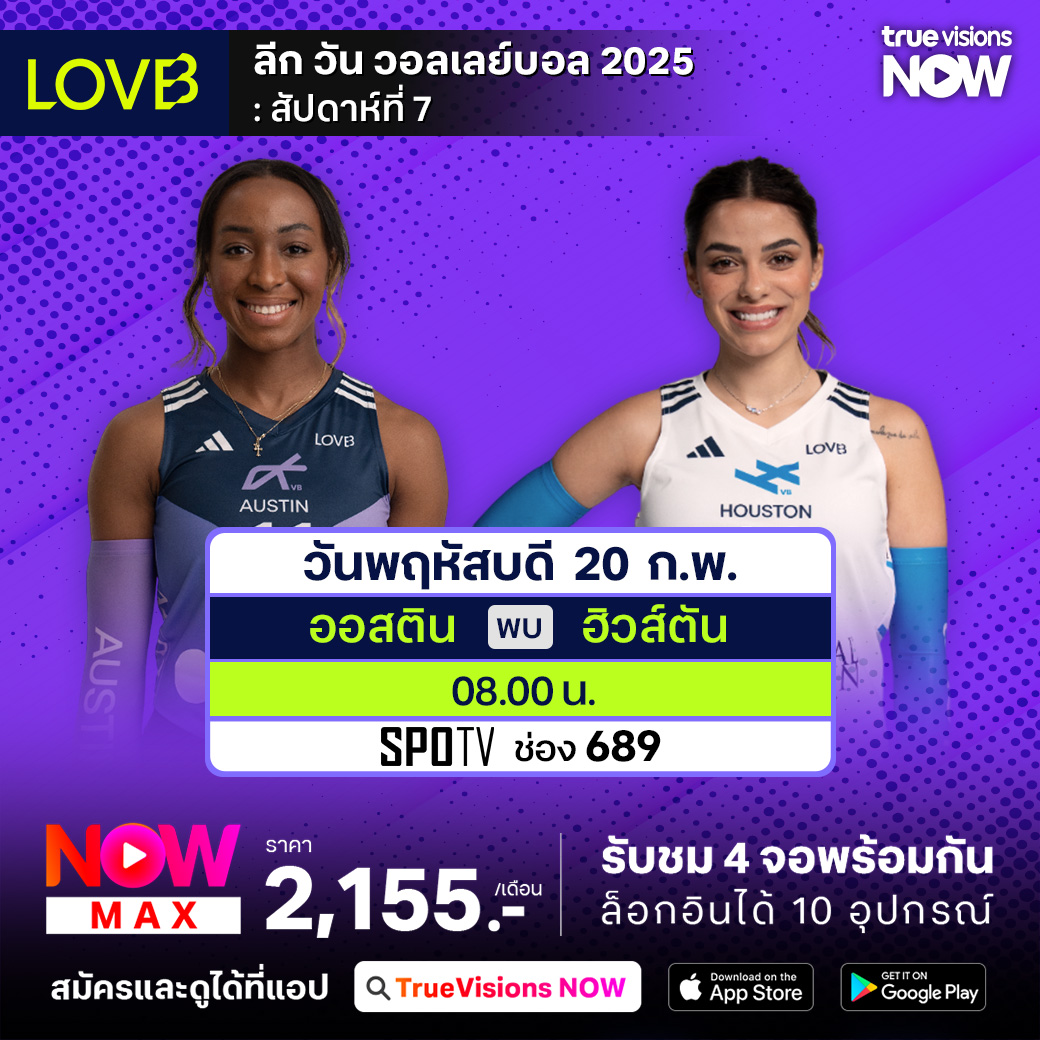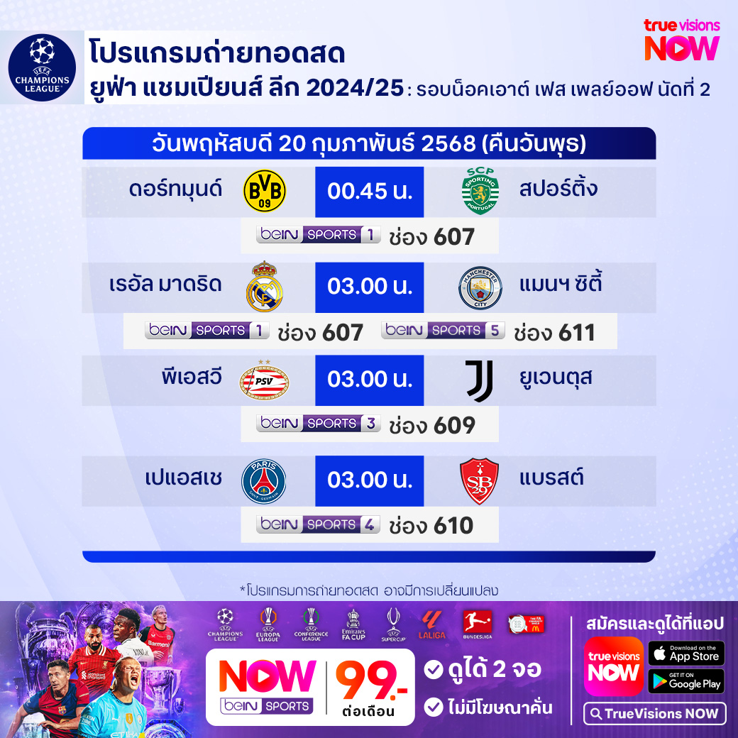 วันนี้มีอะไรดูที่ ทรูวิชั่นส์ ประจำวันพุธที่ 19 กุมภาพันธ์ 68 ยังคงมีกีฬาที่น่าสนใจให้ได้ตามลุ้นตามเชียร์กันเหมือนเดิม โดยในส่วนของฟุตบอลนั้นยังมีศึกพรีเมียร์ลีก อังกฤษ และ ยูฟ่า แชมเปี้ยนส์ ลีก รอบ น็อคเอาท์ เฟส เพลย์ออฟ นัดที่สอง ให้ได้ตามเชียร์กันต่อ ส่วนกีฬาอื่นๆ ยังมีเทนนิส เอทีพี ทัวร์ รายการ กาตาร์ โอเพ่น, เอทีพี ทัวร์ รายการ ริโอ โอเพ่น, ดับเบิ้ลยูทีเอ ทัวร์ รายการ ดูไบ แชมเปี้ยนชิพส์, เดอะ กอล์ฟ ลีก 2025, วอลเลย์บอล แอลโอวีบี และ เอสวี ลีก งานนี้ ทรูวิชั่นส์ จัดเต็มให้ชมกันถึงบ้าน