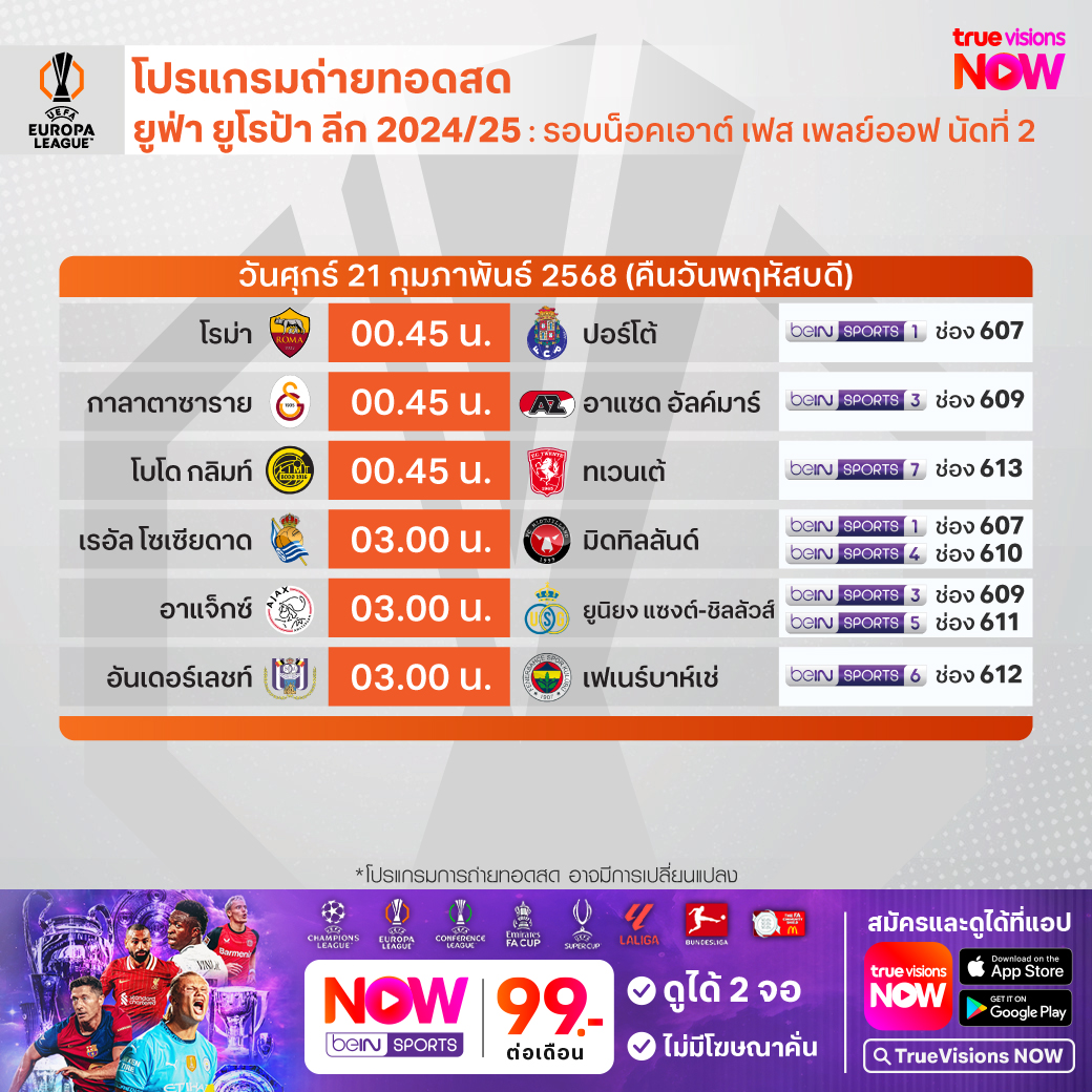 วันนี้มีอะไรดูที่ ทรูวิชั่นส์ ประจำวันพฤหัสบดีที่ 20 กุมภาพันธ์ 68 ยังคงมีกีฬาที่น่าสนใจให้ได้ตามลุ้นตามเชียร์กันเหมือนเดิม โดยในส่วนของฟุตบอลนั้นยังมีศึกยูฟ่า ยูโรป้า ลีก รอบ น็อคเอาท์ เฟส เพลย์ออฟ นัดที่สอง ให้ได้ตามเชียร์กันต่อ ส่วนกีฬาอื่นๆ ยังมีเทนนิส เอทีพี ทัวร์ รายการ กาตาร์ โอเพ่น, เอทีพี ทัวร์ รายการ ริโอ โอเพ่น, ดับเบิ้ลยูทีเอ ทัวร์ รายการ ดูไบ แชมเปี้ยนชิพส์, กอล์ฟ พีจีเอ ทัวร์ รายการ เม็กซิโก โอเพ่น, ดีพี เวิลด์ ทัวร์ รายการ เมจิคอล เคนย่า โอเพ่น, แอลพีจีเอ ทัวร์ รายการ ฮอนด้า แอลพีจีเอ ไทยแลนด์, วอลเลย์บอล แอลโอวีบี และ เอสวี ลีก และศึกบาสเกตบอลเอ็นบีเอ งานนี้ ทรูวิชั่นส์ จัดเต็มให้ชมกันถึงบ้าน