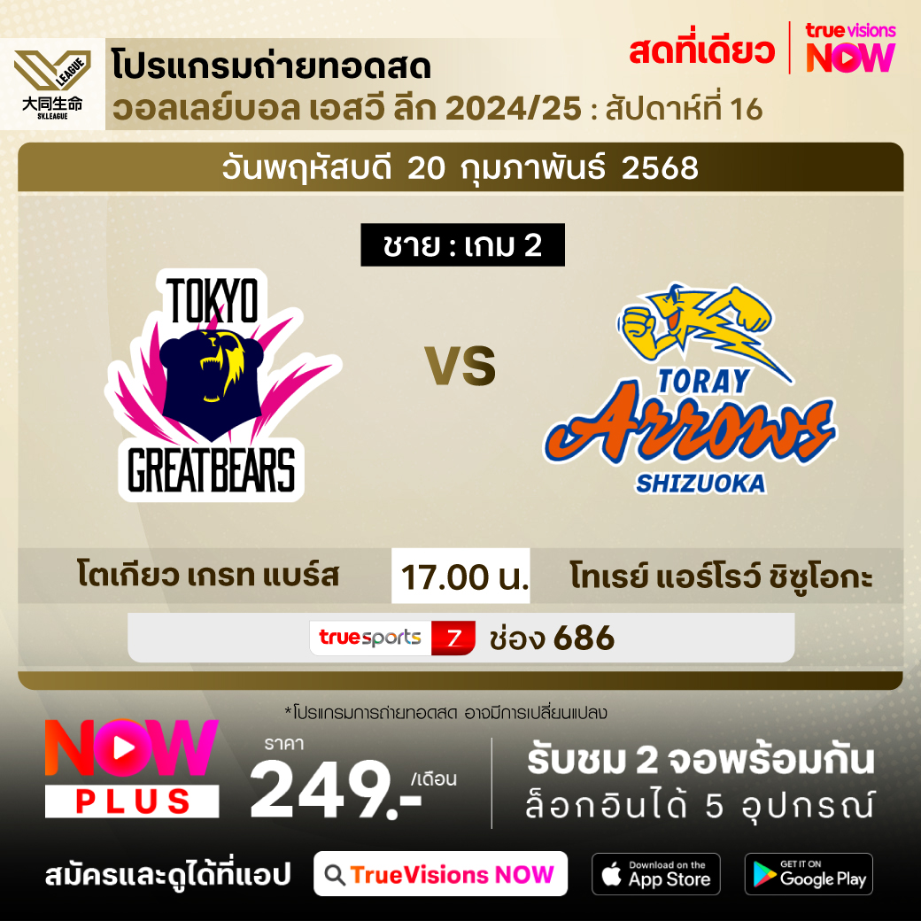 โตเกียว เกรท แบร์ส พบ โทเรย์ แอร์โรว์ ชิซูโอกะ เวลา 17.00 - 19.30 ทางช่อง TS 7 (686)
