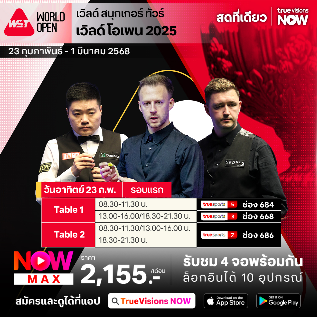 เวิลด์ สนุกเกอร์ ทัวร์ รายการเก็บคะแนนสะสมโลก เดินทางกลับไปเยือนจีนแผ่นดินใหญ่เป็นครั้งที่ 4 ในฤดูกาลนี้ กับรายการที่แฟนๆ รอคอย เวิลด์ โอเพ่น 2025 ที่ ยู่ฉาน ประเทศจีน มือระดับท็อปของ เวิลด์ แรงค์กิ้ง ตบเท้าไปร่วมสอยคิว เพื่อลุ้นเป็นแชมป์กันอย่างคับคั่ง กับเงินรางวัลรวมมหาศาล 825,000 ปอนด์ หรือประมาณ 34.7 ล้านบาท ชมสด เอ็กซ์คลูซีฟ ครบทุกรอบ ที่เดียว ที่ ทรูวิชั่นส์