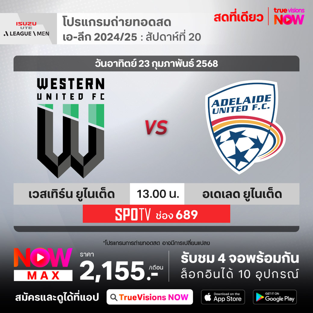 Western United vs Adelaide United เวลา 13.00-15.00 ทางช่อง SPOTV (689)