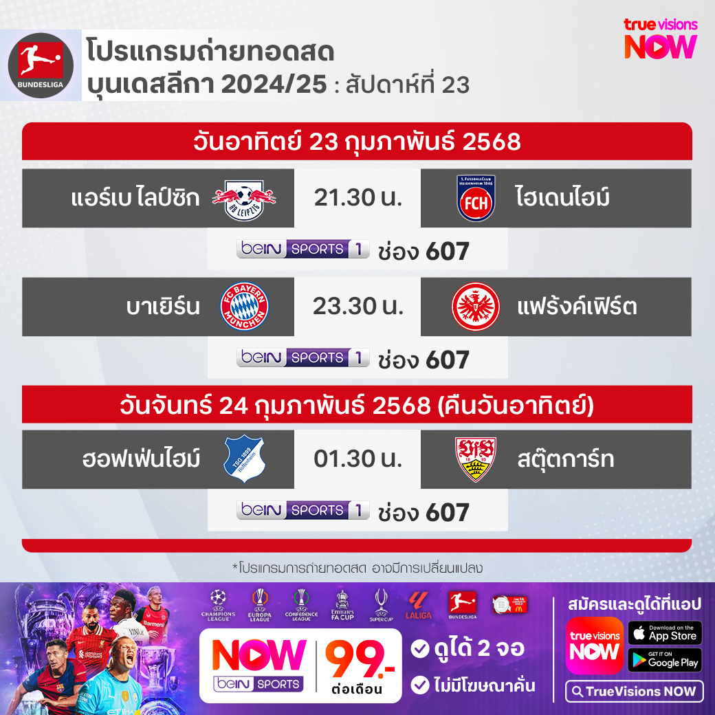 Hoffenheim vs Stuttgart เวลา 01.30-03.30 ทางช่อง beIN 1 (607)