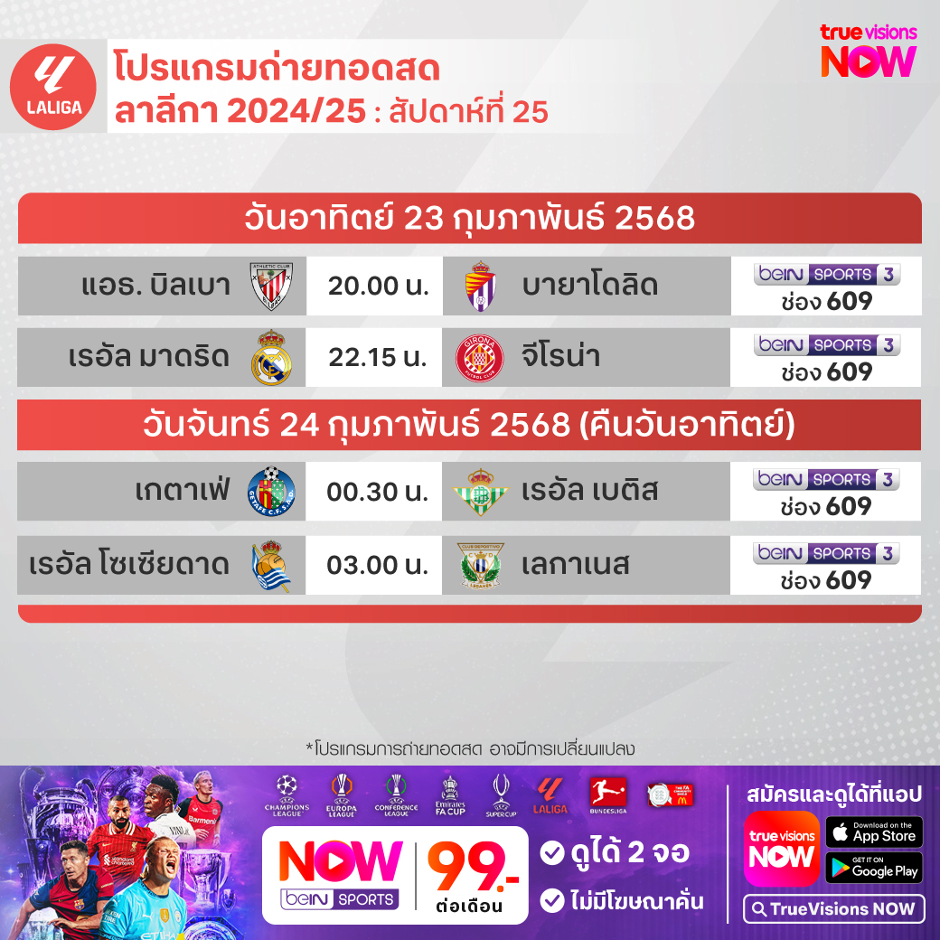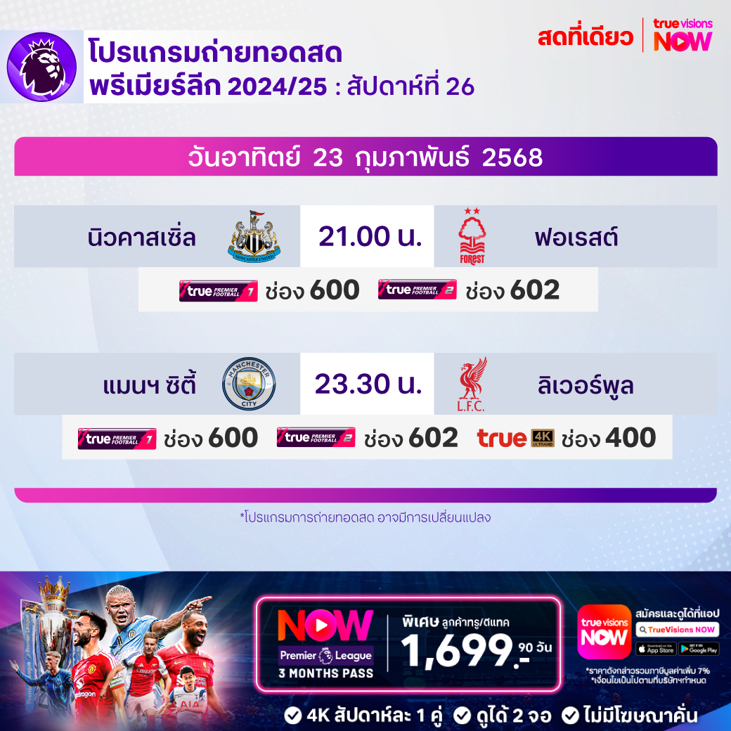 วันนี้มีอะไรดูที่ ทรูวิชั่นส์ ประจำวันอาทิตย์ที่ 23 กุมภาพันธ์ 68 ยังคงมีกีฬาที่น่าสนใจให้ได้ตามลุ้นตามเชียร์กันเหมือนเดิม โดยในส่วนของฟุตบอลนั้นยังมีศึกพรีเมียร์ลีก อังกฤษ, บุนเดสลีกา เยอรมนี, ลา ลีกา สเปน, เอ-ลีก ออสเตรเลีย และ ไทยลีก 1, 2 ให้ได้ตามเชียร์กันต่อ ส่วนกีฬาอื่นๆ ยังมีเทนนิส เอทีพี ทัวร์ รายการ ริโอ โอเพ่น, กอล์ฟ พีจีเอ ทัวร์ รายการ เม็กซิโก โอเพ่น, ดีพี เวิลด์ ทัวร์ รายการ เมจิคอล เคนย่า โอเพ่น, แอลพีจีเอ ทัวร์ รายการ ฮอนด้า แอลพีจีเอ ไทยแลนด์, เวิลด์ สนุกเกอร์ ทัวร์ รายการ เวิลด์ โอเพ่น, ยูเอฟซี ไฟต์ ไนท์, วอลเลย์บอล เอสวี ลีก และ รักบี้ ซิกซ์ เนชั่นส์ งานนี้ ทรูวิชั่นส์ จัดเต็มให้ชมกันถึงบ้าน