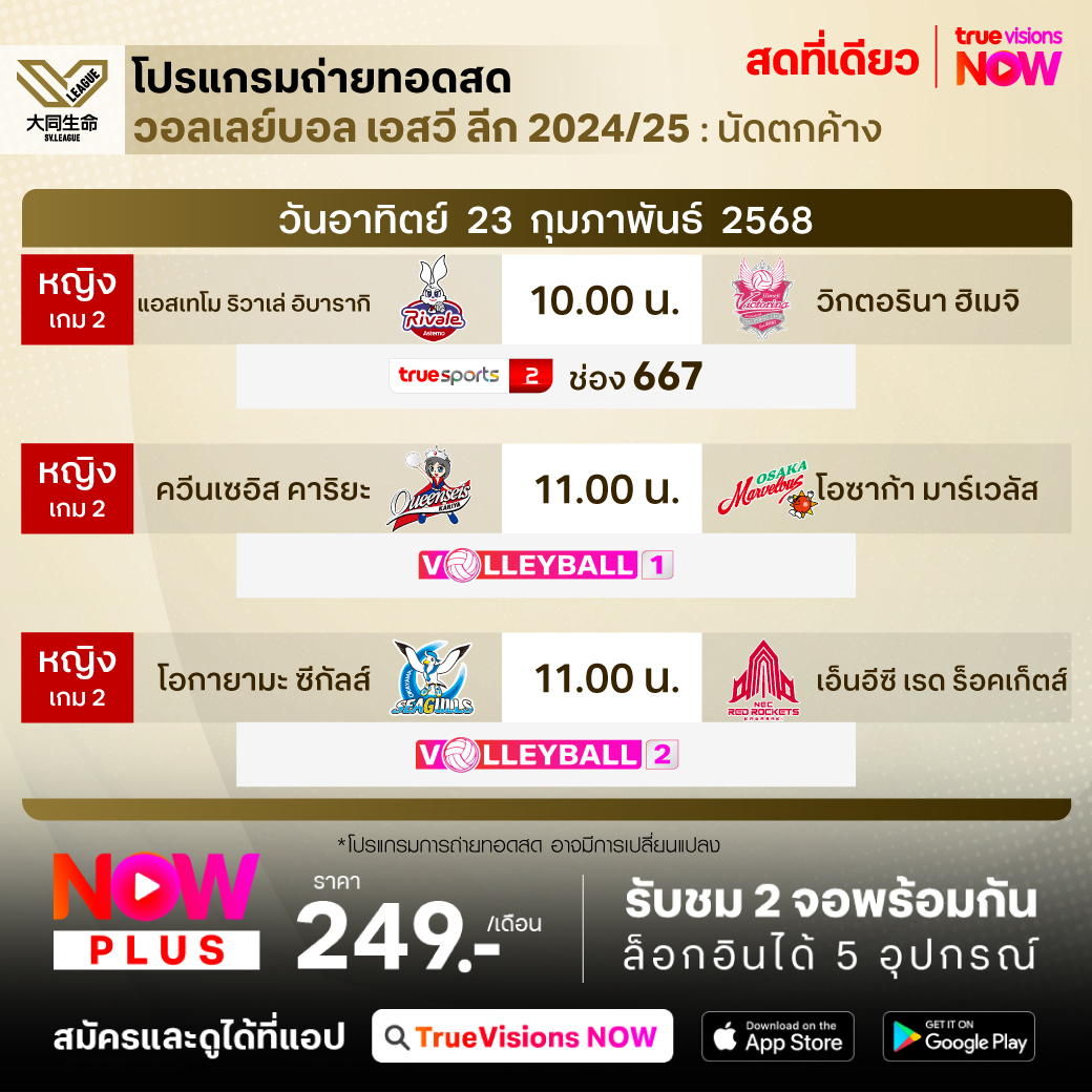 ควีนเซอิส คาริยะ พบ โอซาก้า มาร์เวลัส เวลา 11.00 - 13.30 ทางช่อง Volleyball 1