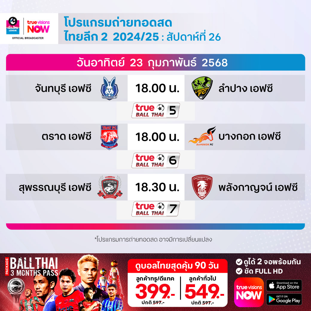 จันทบุรี เอฟซี พบ ลำปาง เอฟซี เวลา 18.00-20.00 ทางช่อง True Ball Thai 5