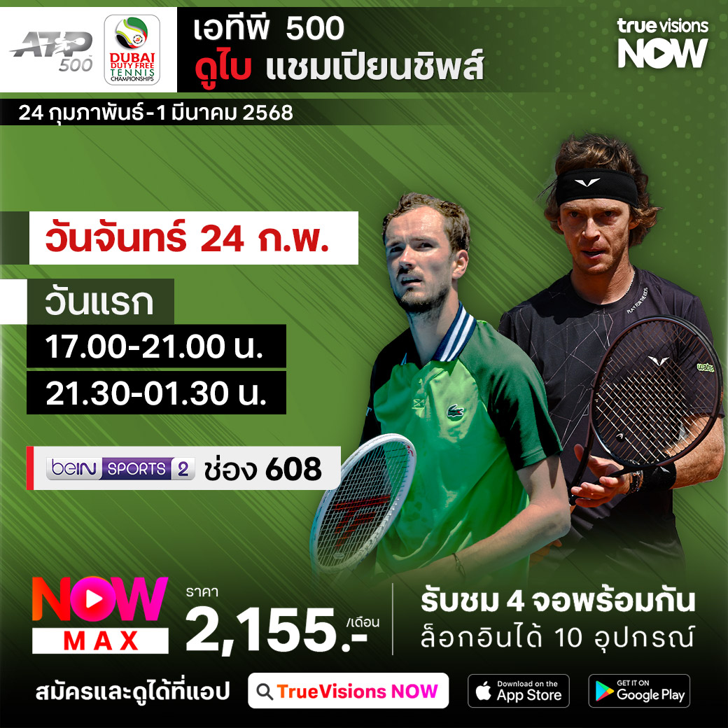 เทนนิส เอทีพี ทัวร์ สัปดาห์นี้ พบกับรายการใหญ่จากภูมิภาคตะวันออกกลางรายการสุดท้ายของปี ดูไบ แชมเปี้ยนชิพส์ ที่เมืองดูไบ สหรัฐอาหรับเอมิเรตส์ รายการนี้รวมดารานักเทนนิสเข้าร่วมการแข่งขันอย่างครบครัน ถือเป็นการเตรียมตัวก่อนเข้าสู่รายการใหญ่ในเดือนมีนาคม ร่วมลุ้นกันว่าใครจะคว้าแชมป์ไปครอง ชมสด ครบทุกรอบ ที่ ทรูวิชั่นส์