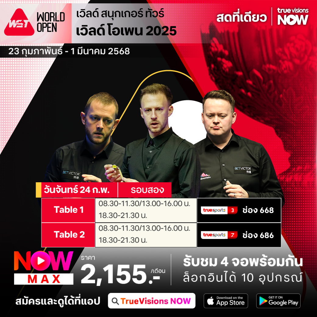 เวิลด์ สนุกเกอร์ ทัวร์ รายการเก็บคะแนนสะสมโลก เดินทางกลับไปเยือนจีนแผ่นดินใหญ่เป็นครั้งที่ 4 ในฤดูกาลนี้ กับรายการที่แฟนๆ รอคอย เวิลด์ โอเพ่น 2025 ที่ ยู่ฉาน ประเทศจีน มือระดับท็อปของ เวิลด์ แรงค์กิ้ง ตบเท้าไปร่วมสอยคิว เพื่อลุ้นเป็นแชมป์กันอย่างคับคั่ง กับเงินรางวัลรวมมหาศาล 825,000 ปอนด์ หรือประมาณ 34.7 ล้านบาท ชมสด เอ็กซ์คลูซีฟ ครบทุกรอบ ที่เดียว ที่ ทรูวิชั่นส์